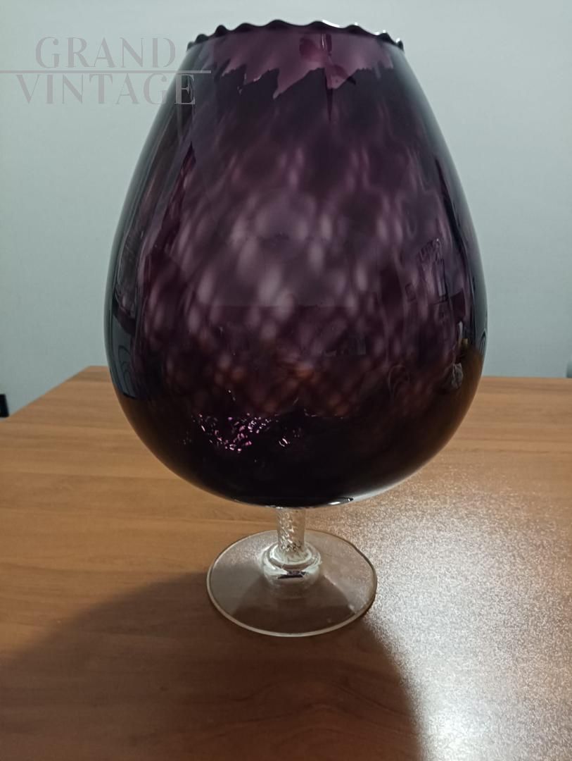 Splendido e grande vaso vintage italiano anni '60 in vetro artistico viola opalescente soffiato a mano con forma a calice, il piede è applicato mano.