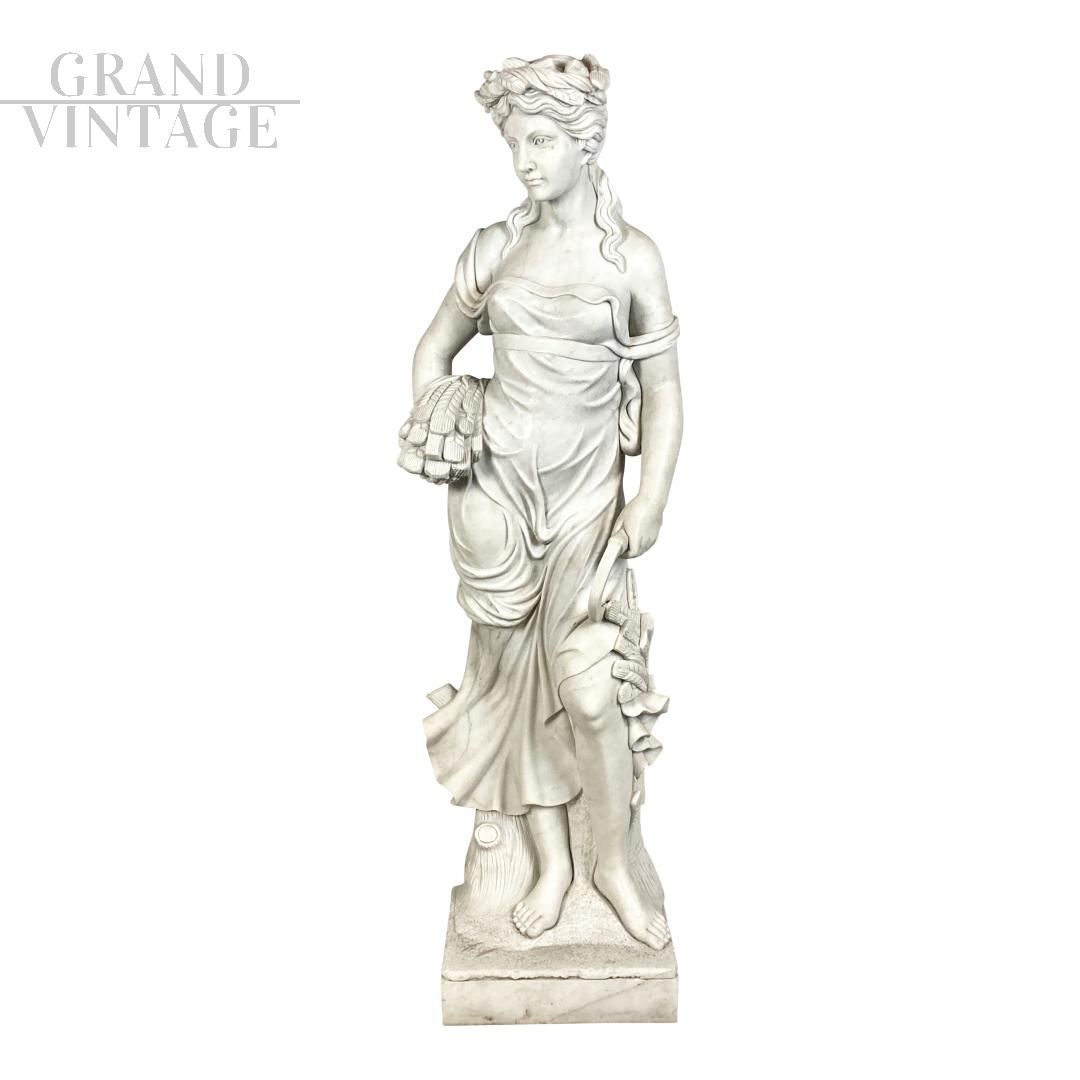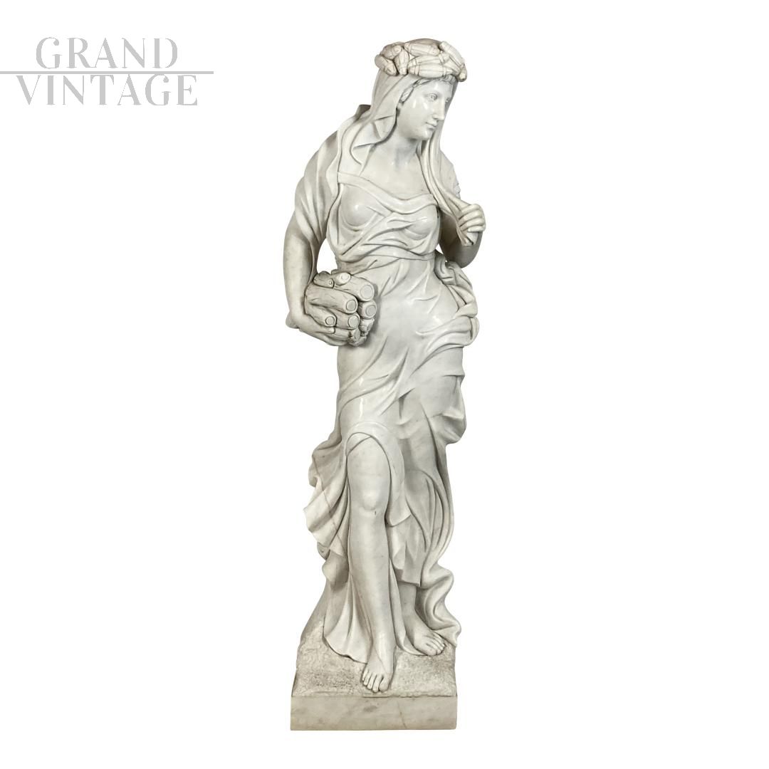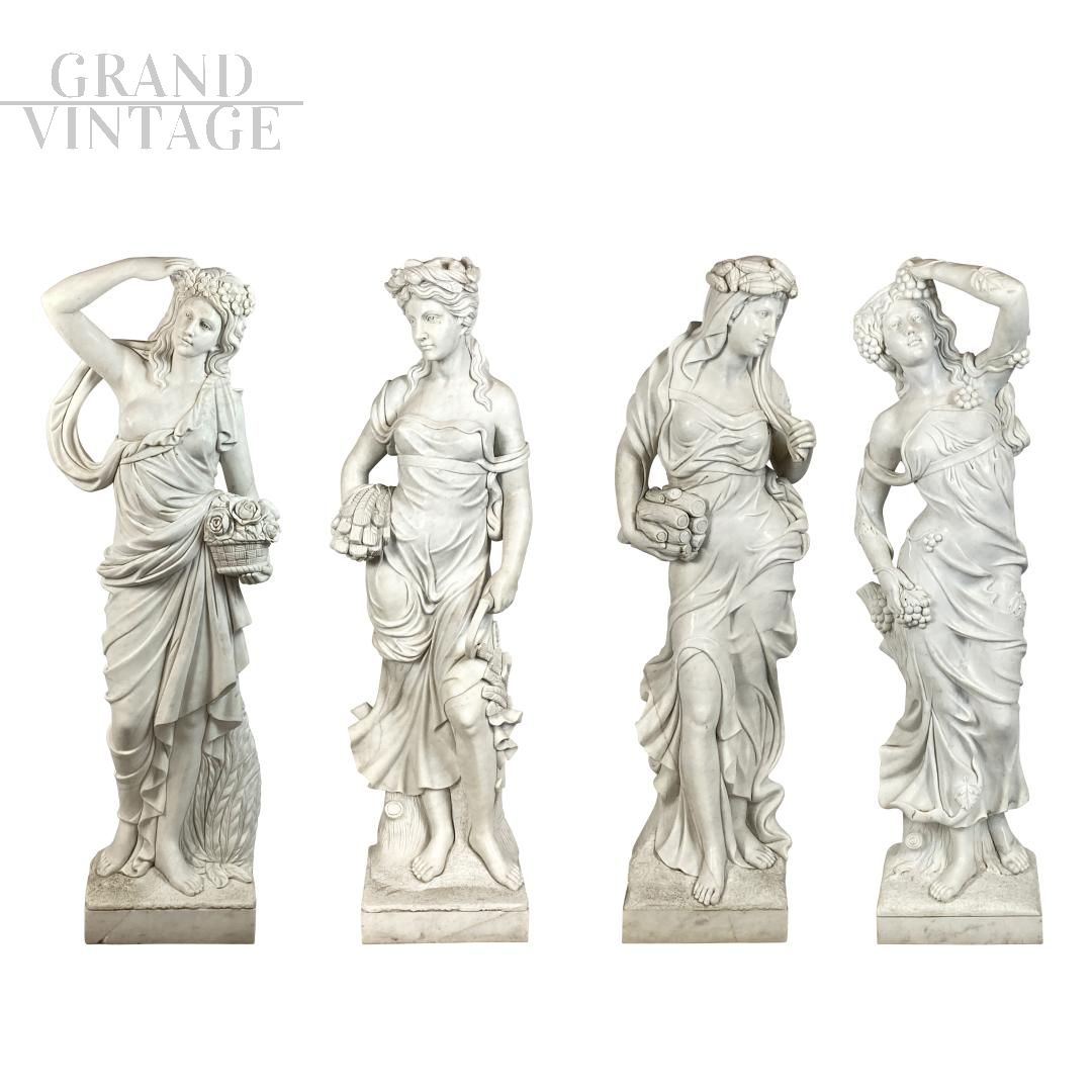 Gruppo di 4 statue pregiate in marmo bianco raffiguranti Le Quattro Stagioni rappresentate allegoricamente da figure femminili, adatte per decorare con eleganza un giardino. L'Estate è rappresentata con la spiga, la Primavera con le rose, l’Autunno con l’uva e l’Inverno con la legna da ardere.