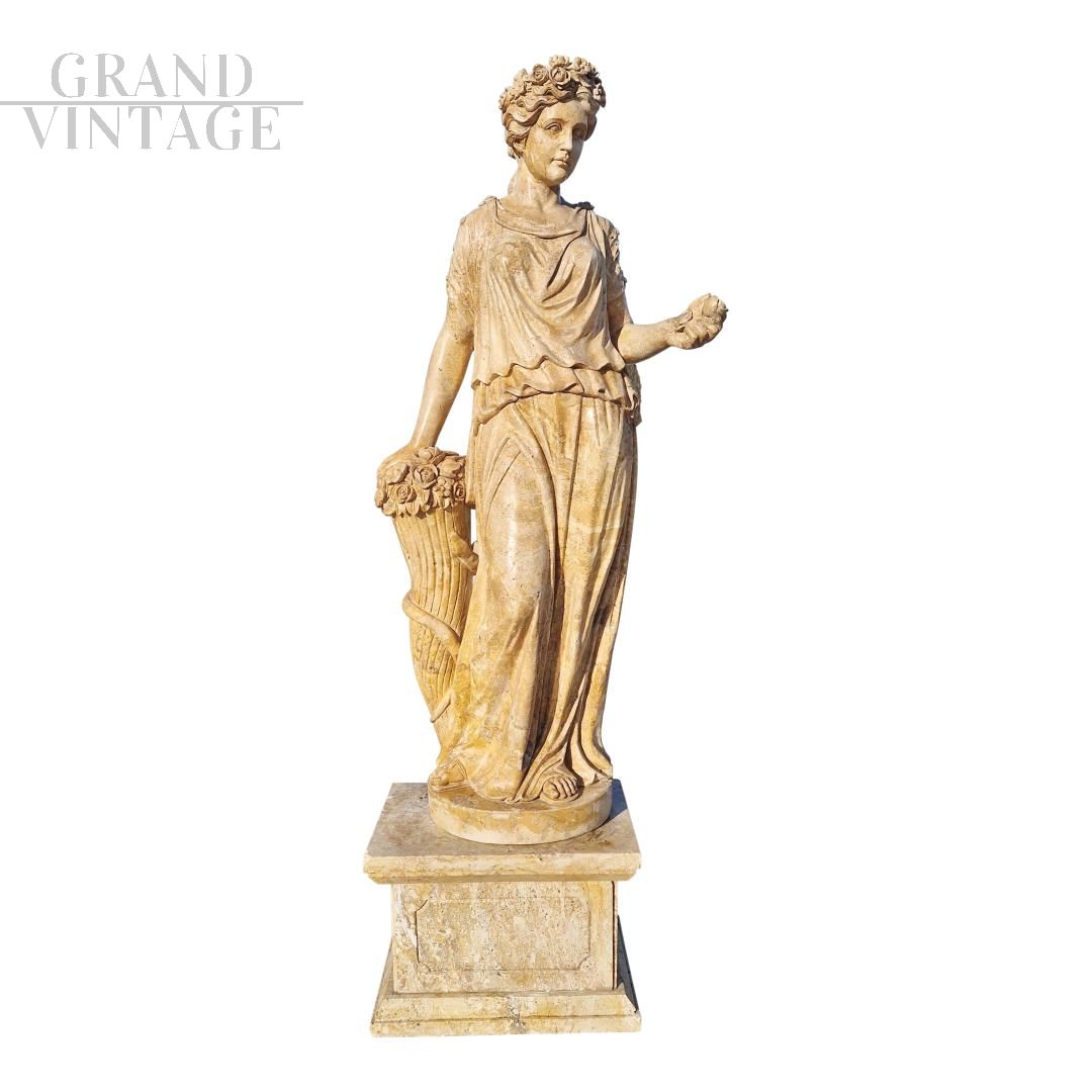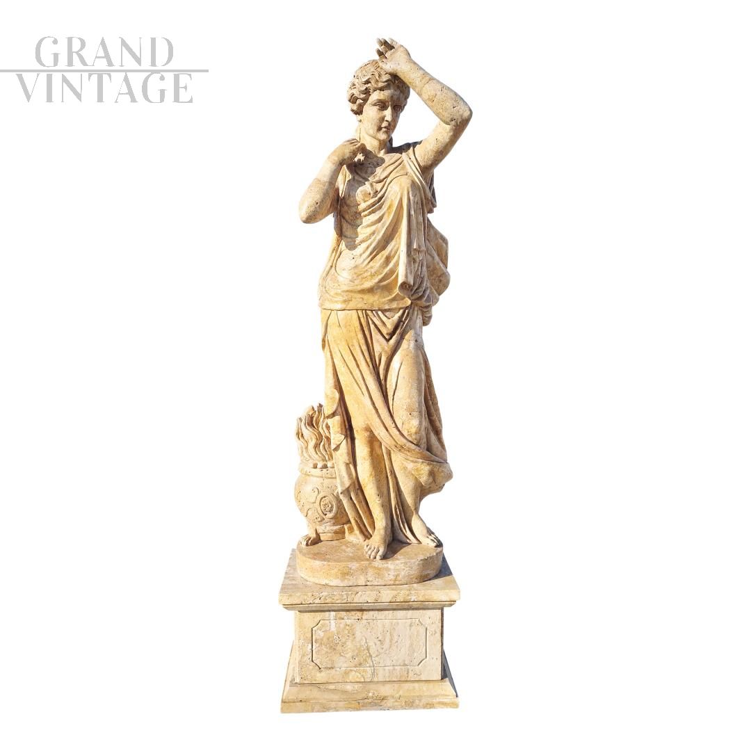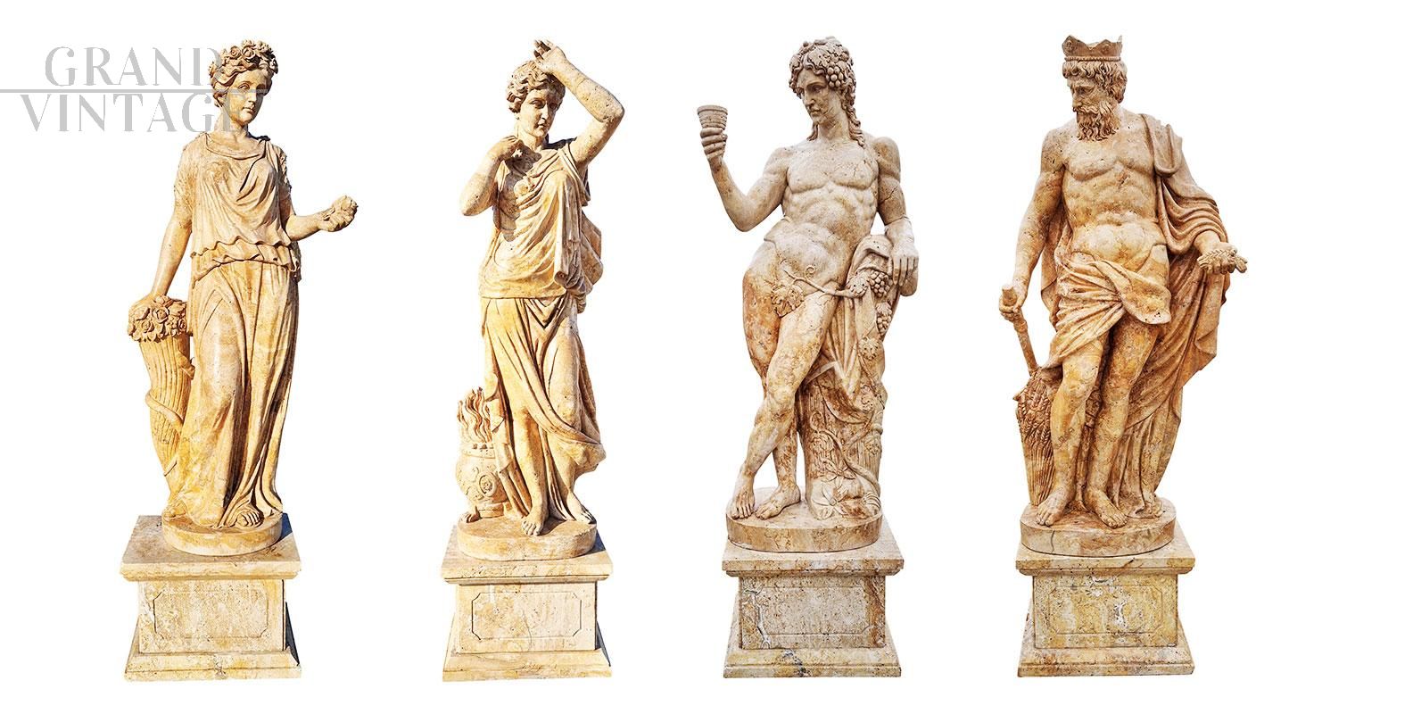 Gruppo di 4 statue pregiate in marmo travertino raffiguranti Le Quattro Stagioni rappresentate allegoricamente da personaggi neoclassici, adatte per decorare con eleganza un giardino. L'Estate, unica figura maschile, è rappresentata con la spiga, la Primavera con le rose, l’Autunno con l’uva e l’Inverno con il fuoco.