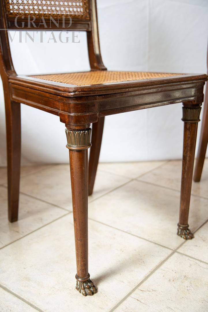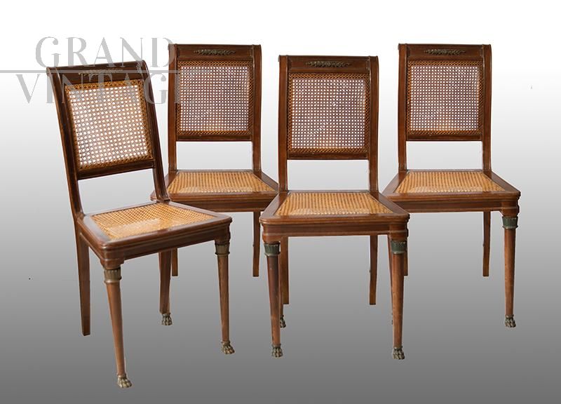 Set di 4 sedie antiche in massello di mogano e paglia di Vienna, appartenente alla seconda metà del XIX secolo. Lo schienale di forma quadrangolare è impreziosito da un'elemento fogliaceo in bronzo. I piedi sono troncoconici e terminano con delle zampe a griffe. Completo di Certificato di Autenticità.