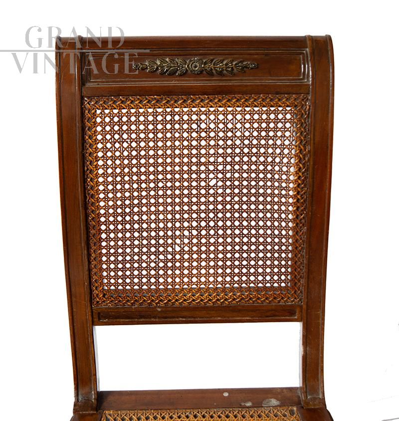 Gruppo di quattro sedie antiche in massello di mogano con innesti in bronzo