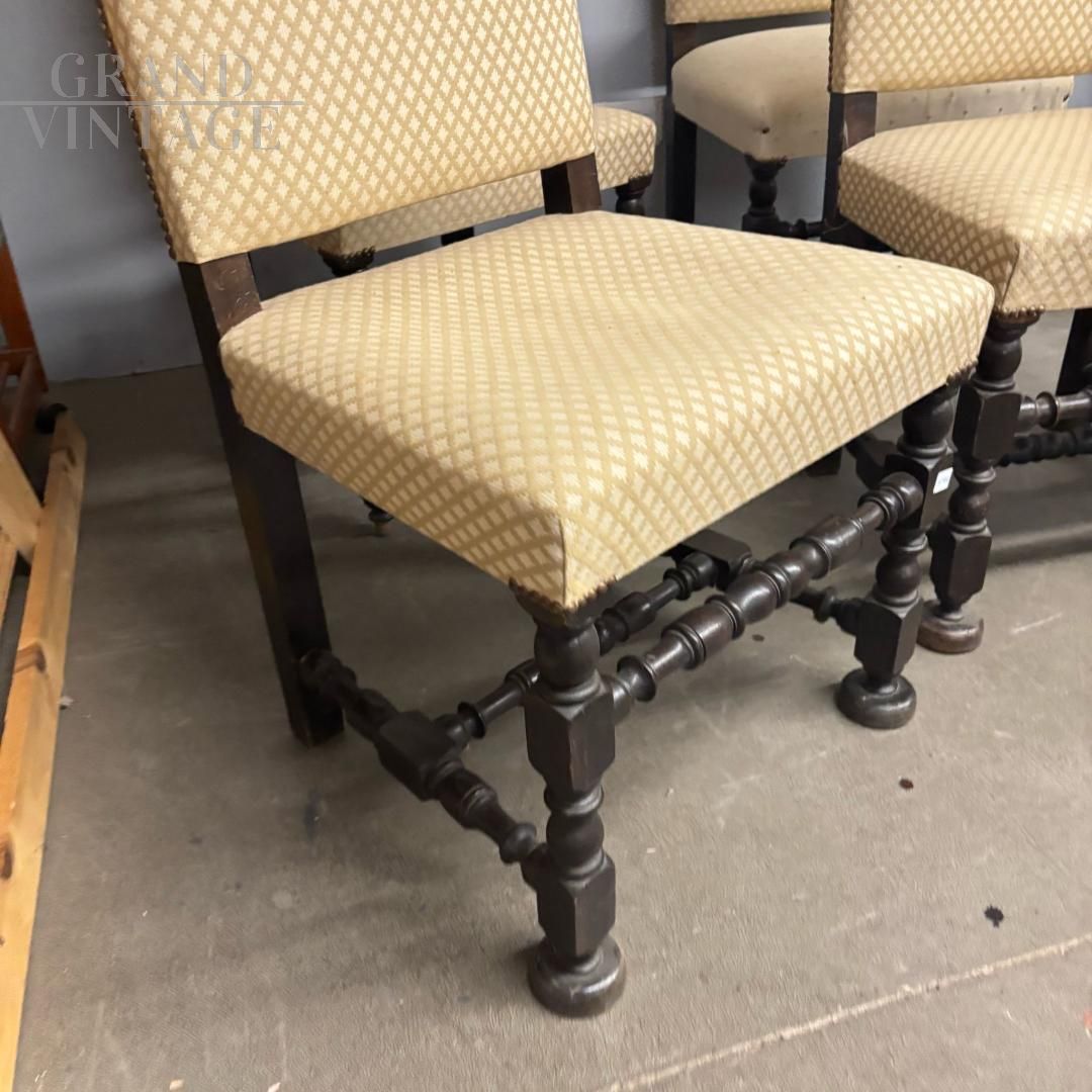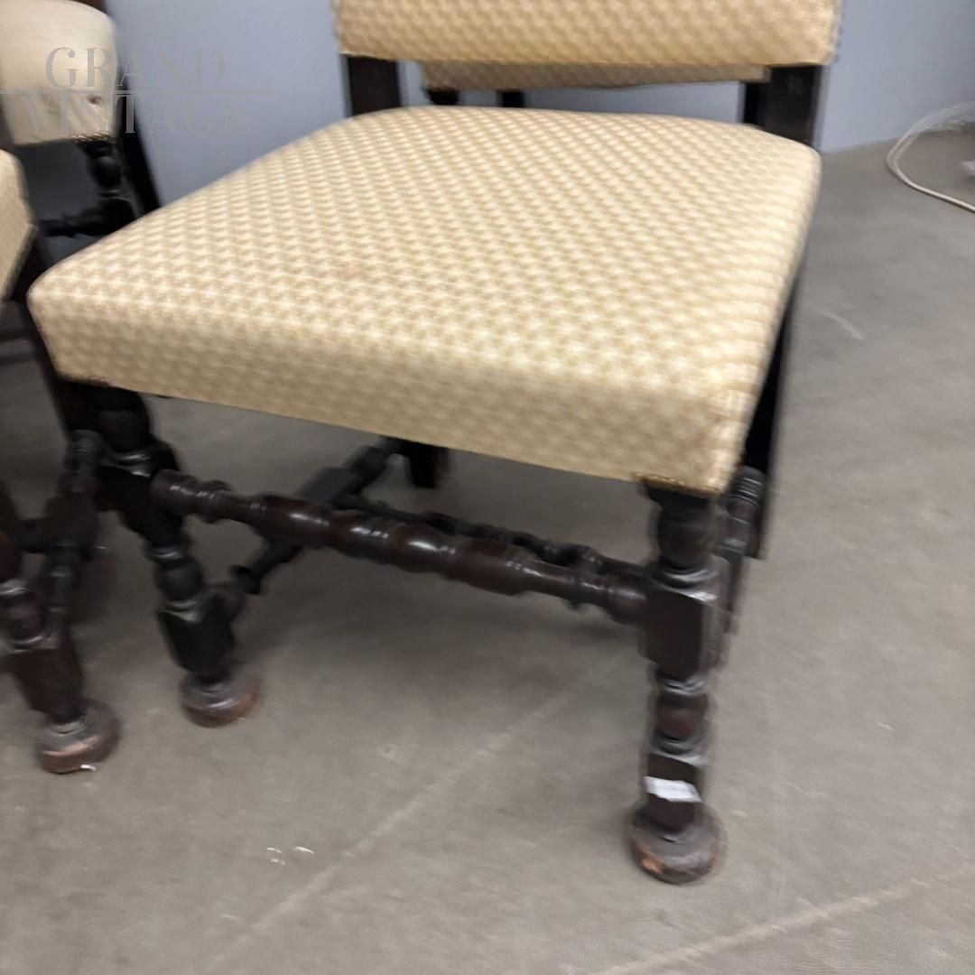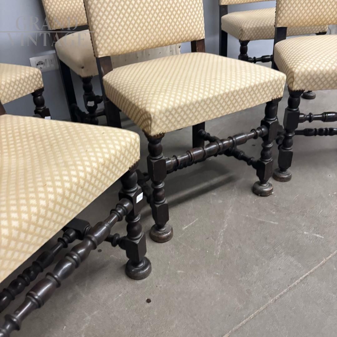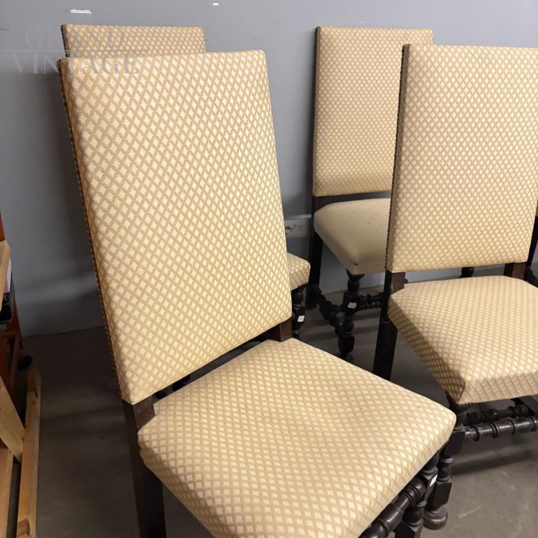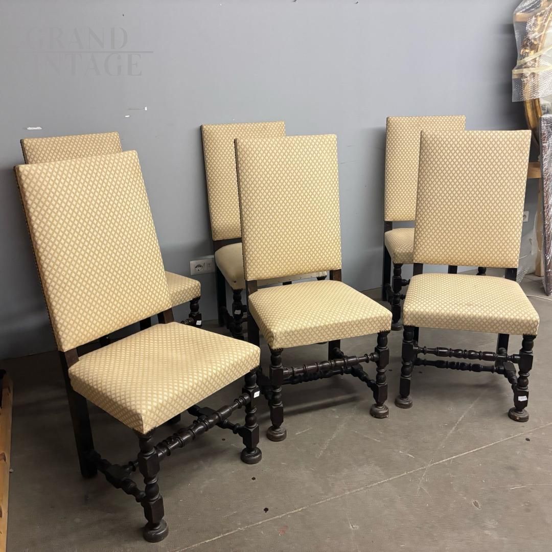 Set di sei sedie antiche a rocchetto con schienale alto, imbottite e rivestite con tessuto color crema con decori geometrici, le gambe hanno una bella lavorazione tornita. Le sedie sono prodotte verso la fine dell'800, sono in buone condizioni, una seduta ha un rivestimento diverso, come da foto.