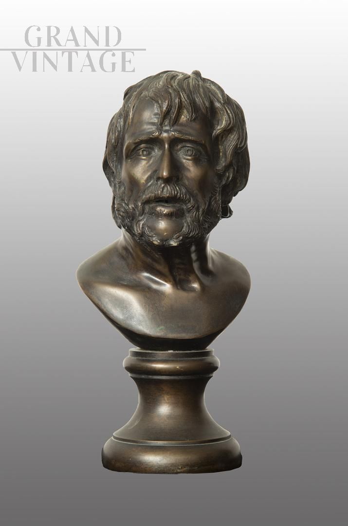 Scultura antica in bronzo brunito raffigurante testa del filosofo Seneca, dello scultore francese Heizler. La testa del filosofo greco Seneca detta anche Pseudo-Seneca in quanto venne scoperto ad Ercolano nel 1754 e rinvenuto nel Museo Archeologico Nazionale di Napoli. L'originale collocato nel I° secolo a.C. è base di ispirazione per numerosi scultori e artisti che ne riproducono le fattezze in fusioni in bronzo.