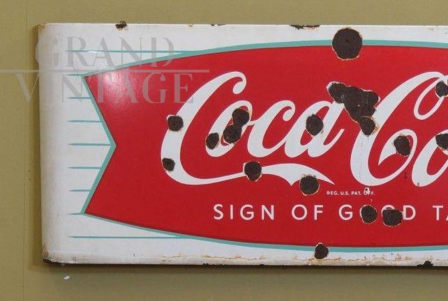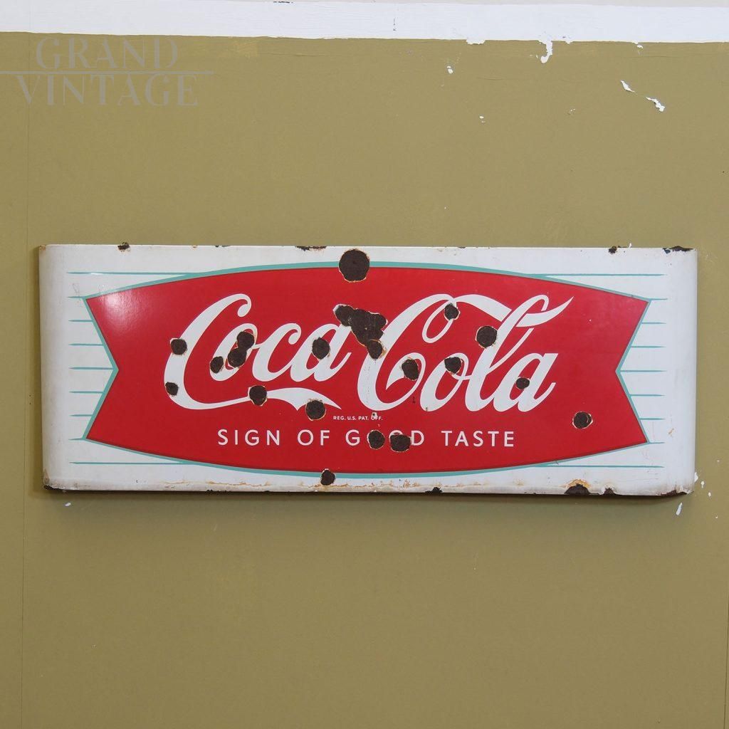 Autenticità e vissuto emergono da questa insegna storica americana con il classico logo Coca Cola bianco su sfondo rosso, perfetta per ambienti industriali o per chi cerca un tocco vintage ricercato.