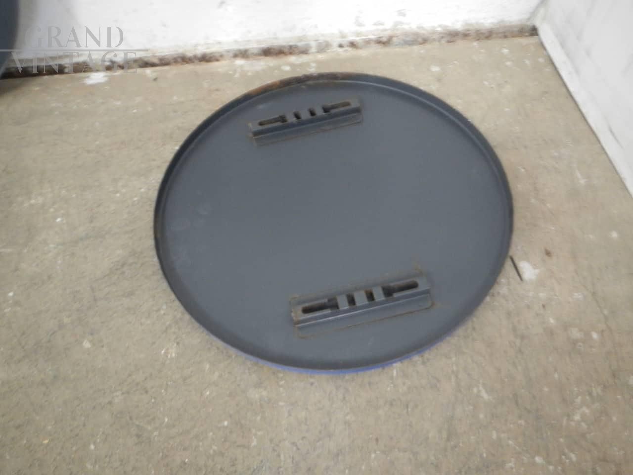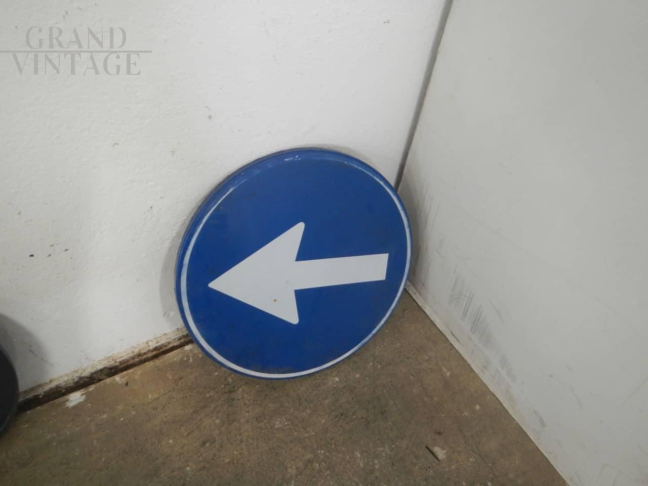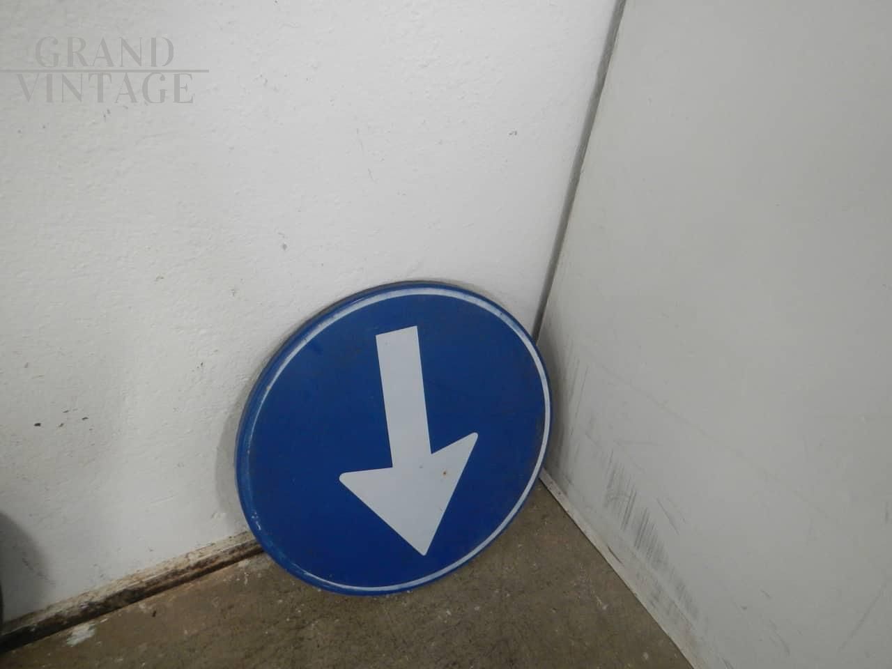 Insegna stradale italiana vintage con freccia di direzione obbligatoria, struttura buona ma segni d'uso consistenti. Disponibili 2 pezzi.