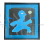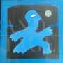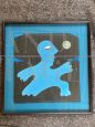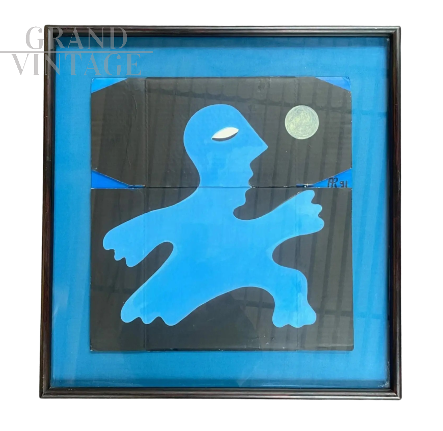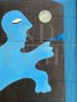 L'Homme Bleu - L'uomo Blu, dipinto ad olio su cartone di Alain Rothstein raffigurante una sagoma blu su sfondo nero con luna, un bellissimo dipinto notturno astratto firmato e datato 1991.