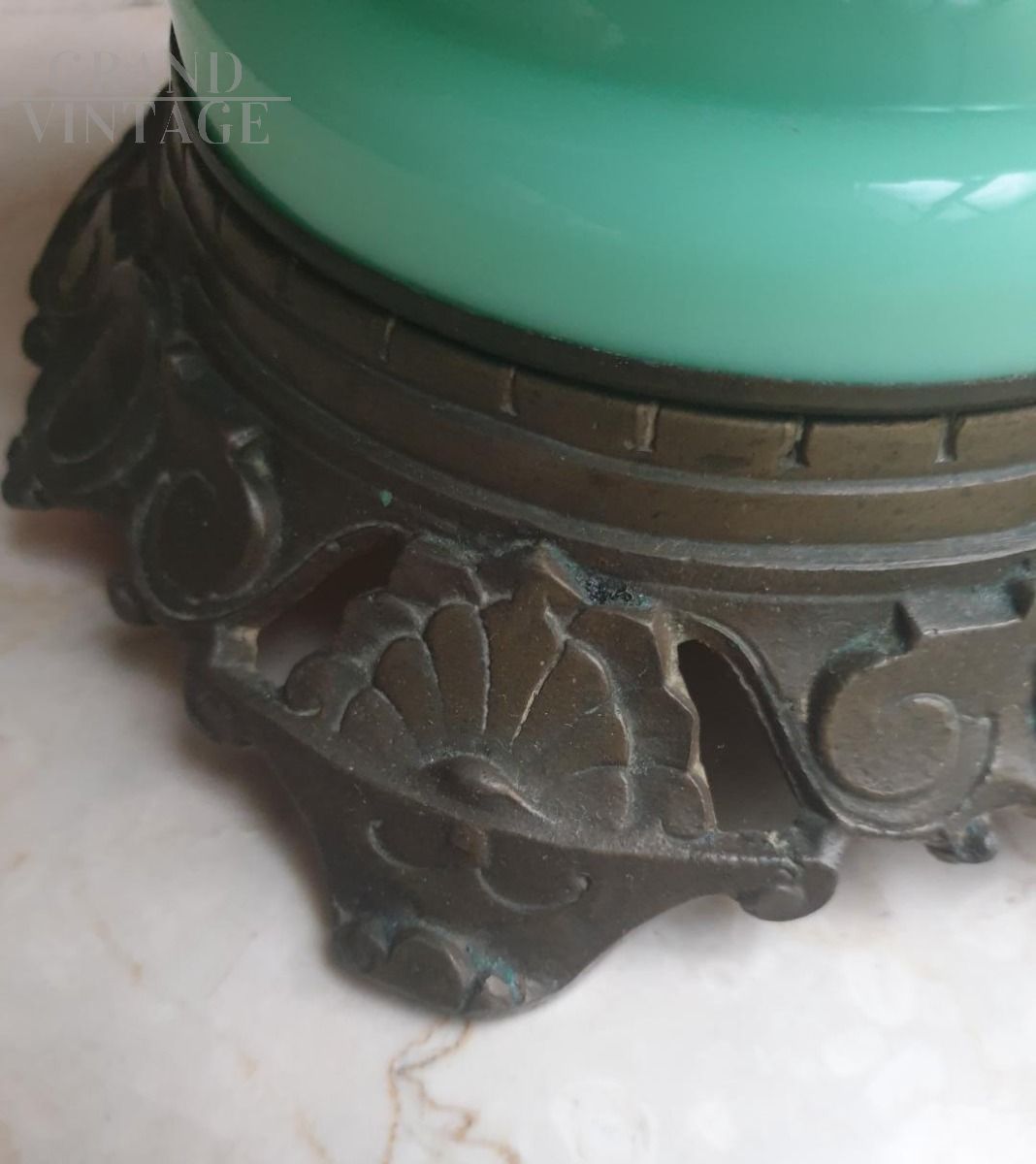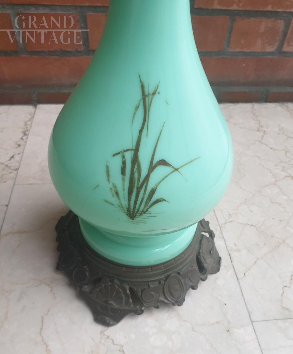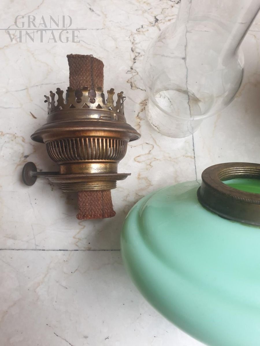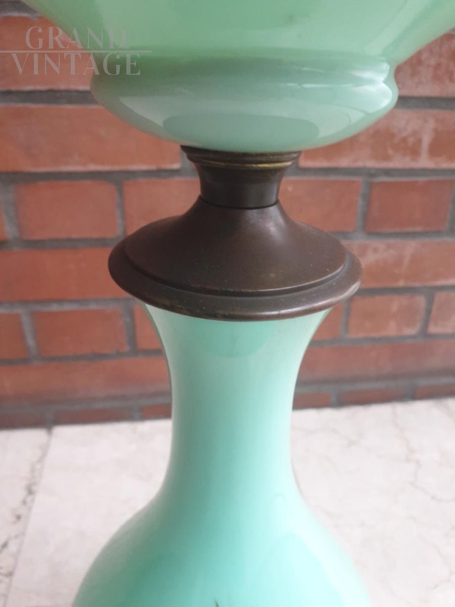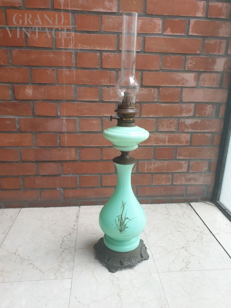 Lampada da tavolo a petrolio vintage in vetro opalino color verde acqua con decorazioni dipinte.