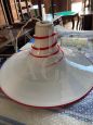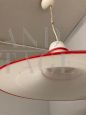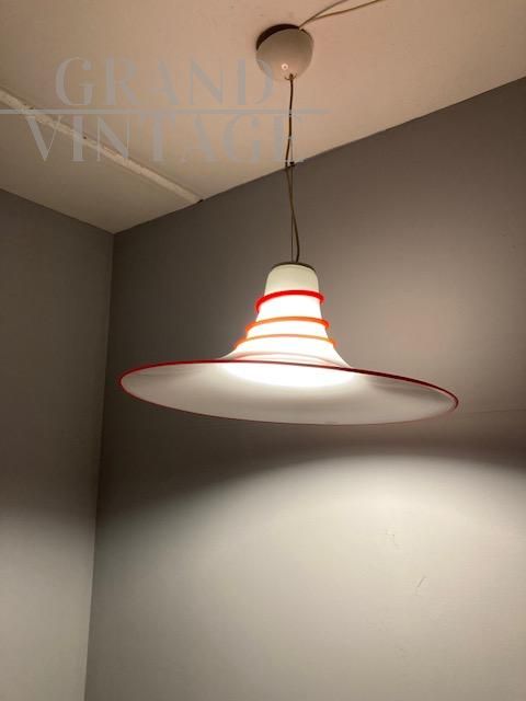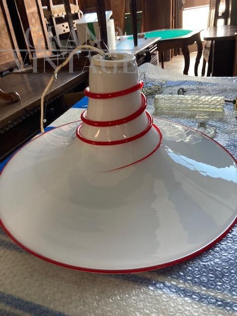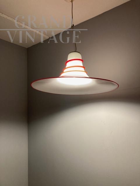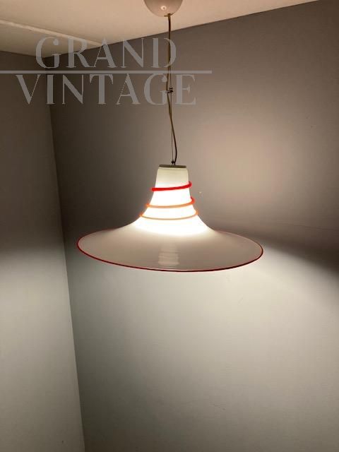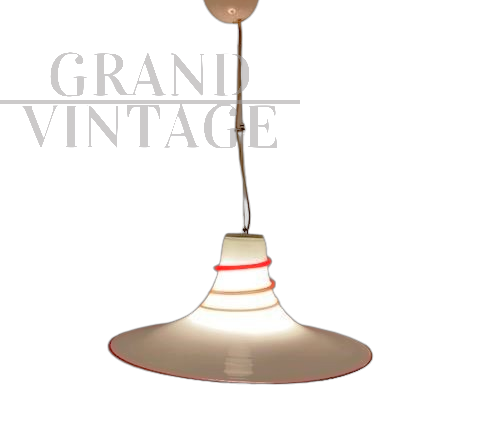 Lampada a sospensione in vetro di Murano con forma caratteristica a Cappello di Strega, anni '70, dal design particolare con questo effetto finissimo molto delicato. In vetro bianco e rifinitura filo rosso. In perfetto stato, con impianto elettrico revisionato.
