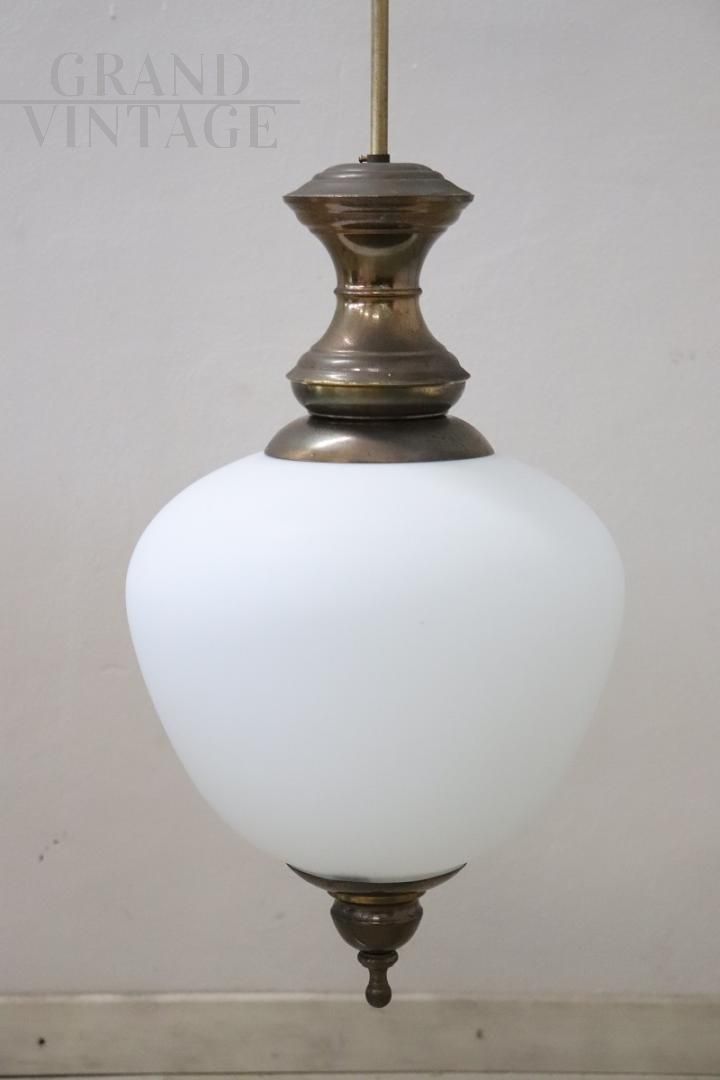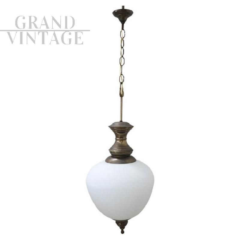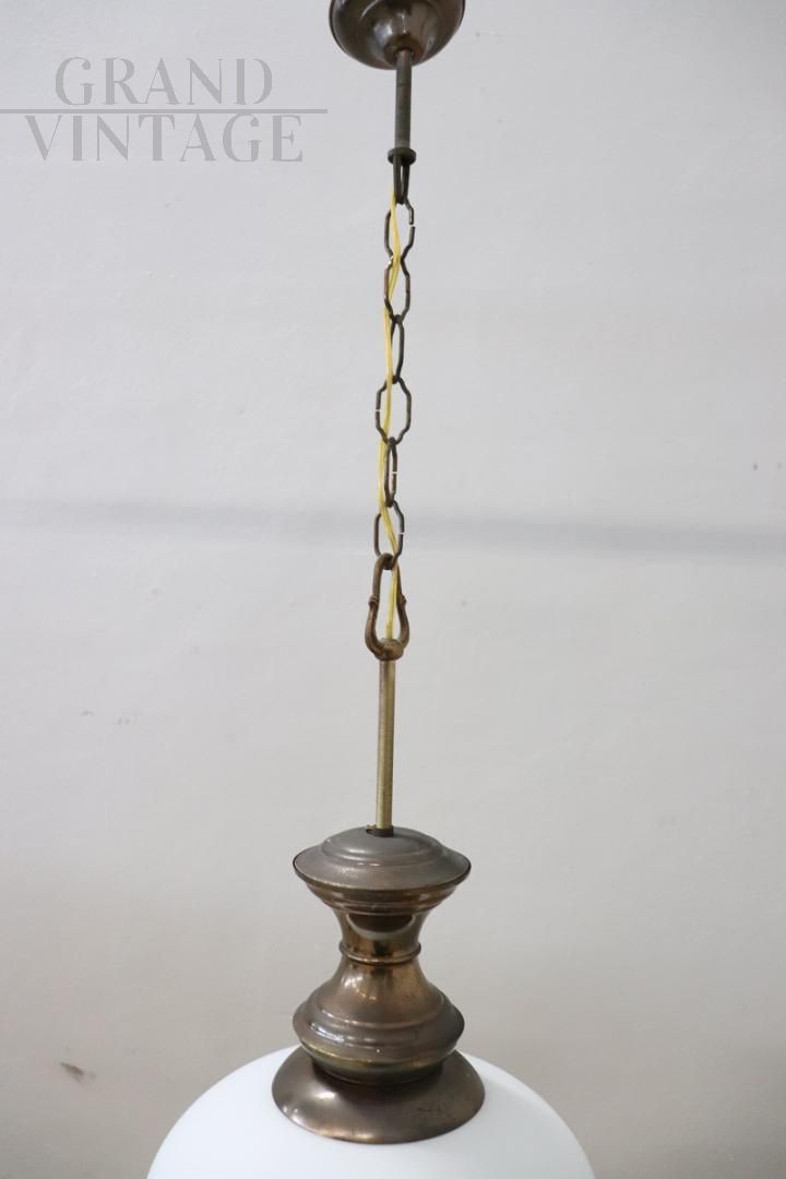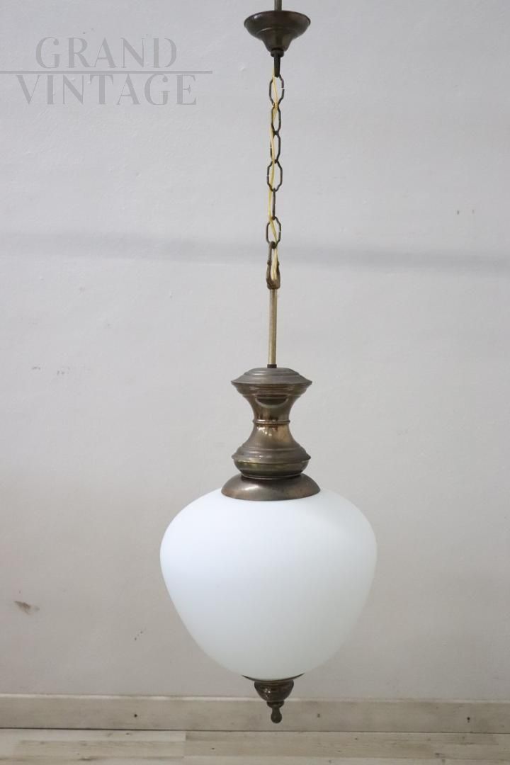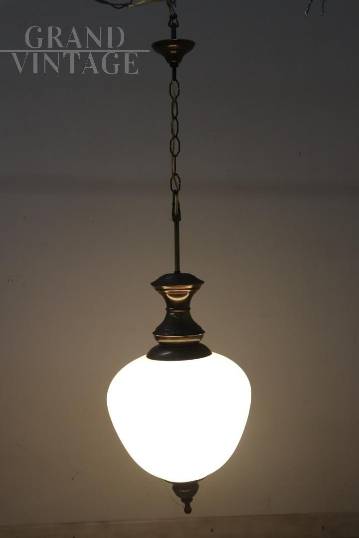 Vi presentiamo una splendida lampada a sospensione di produzione italiana, risalente agli anni '60 circa. Questo squisito pezzo presenta una splendida struttura in ottone patinato abbinata a un'elegante boccia in vetro opalino, che ne esalta l'estetica. La lampada è progettata per ospitare una lampadina interna, garantendo una luce calda e invitante. Sebbene questa lampada non rechi alcun marchio o firma, la sua eccezionale fattura e i materiali di alta qualità suggeriscono fortemente che si tratti di un'opera di Luigi Caccia Dominioni per Azucena. In perfette condizioni e con un impianto elettrico appena ricablato, questa lampada è l'aggiunta ideale a un corridoio, a un ingresso o a qualsiasi angolo accogliente della casa. Prezzo trattabile.