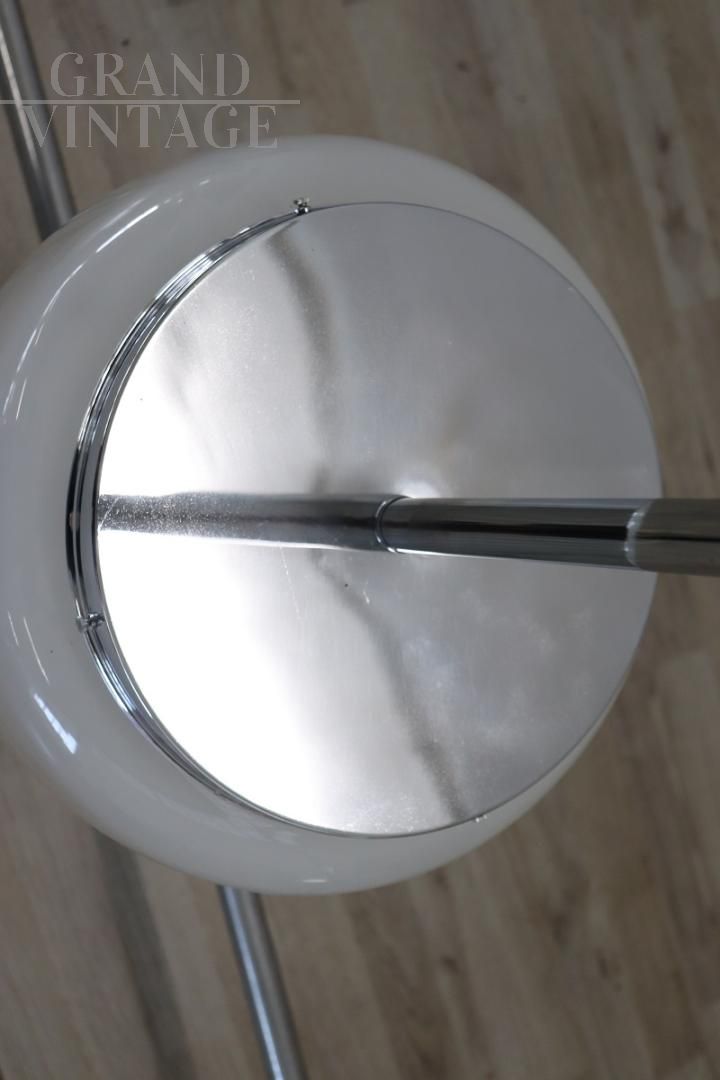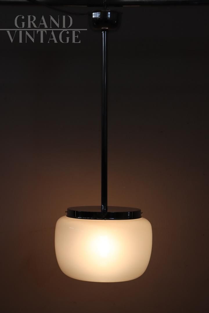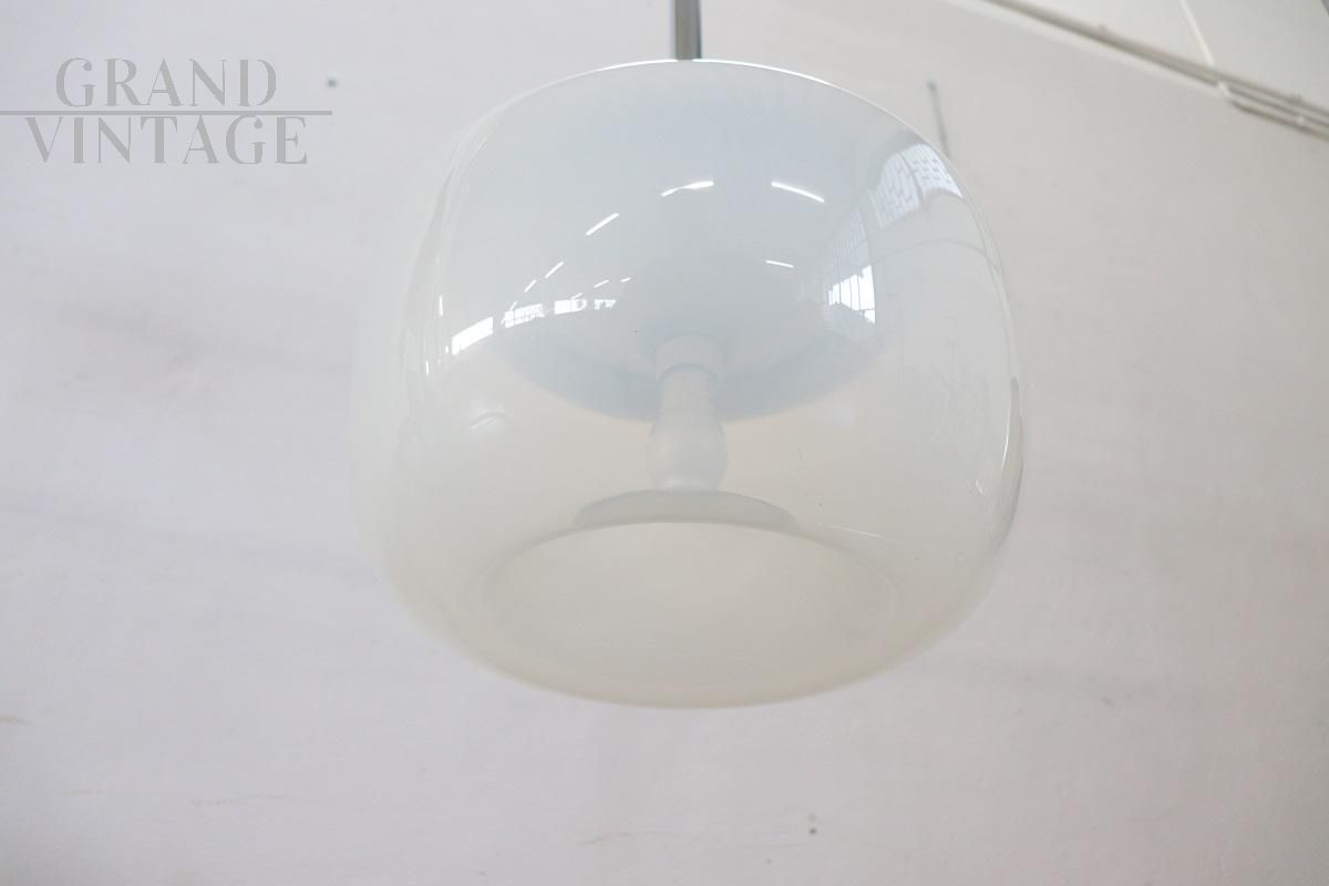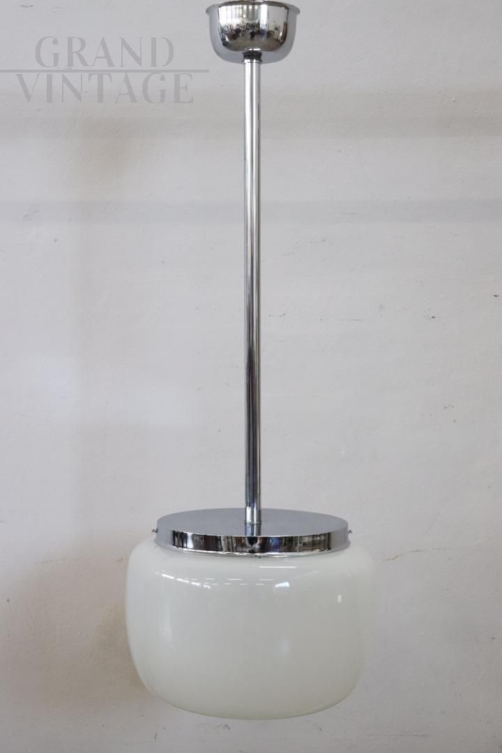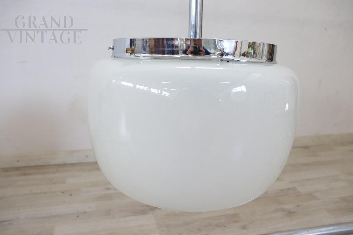 Bellissima e raffinata lampada a sospensione design italiana in vetro opalino bianco e metallo cromato, anni '60. Perfettamente funzionante con un unico punto luce. Prezzo trattabile.