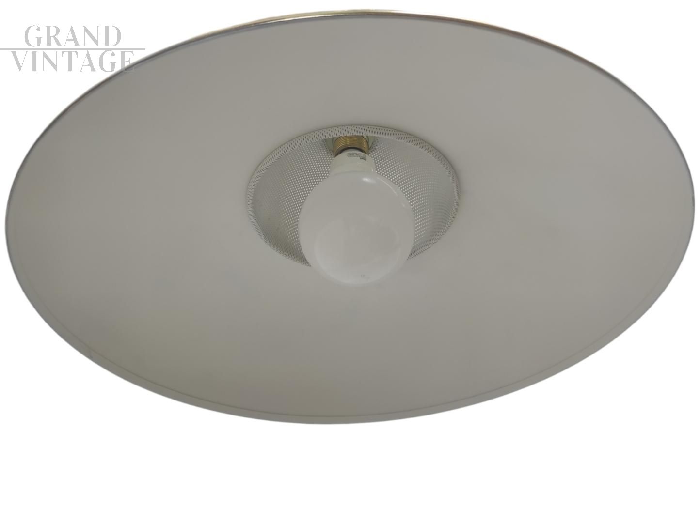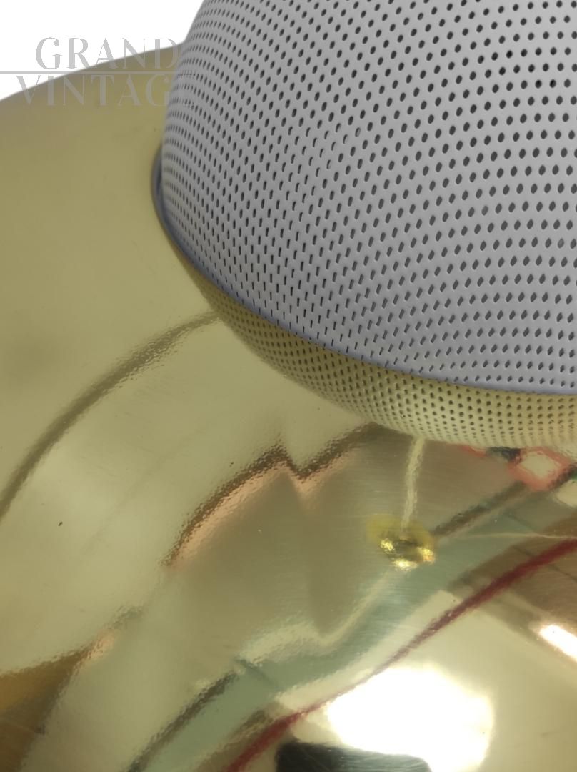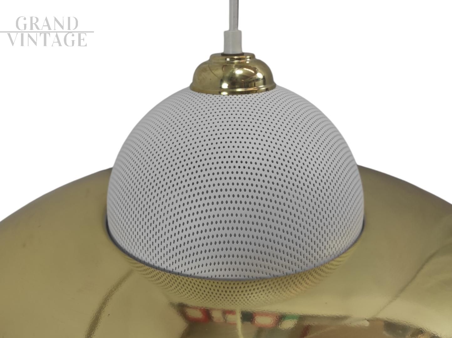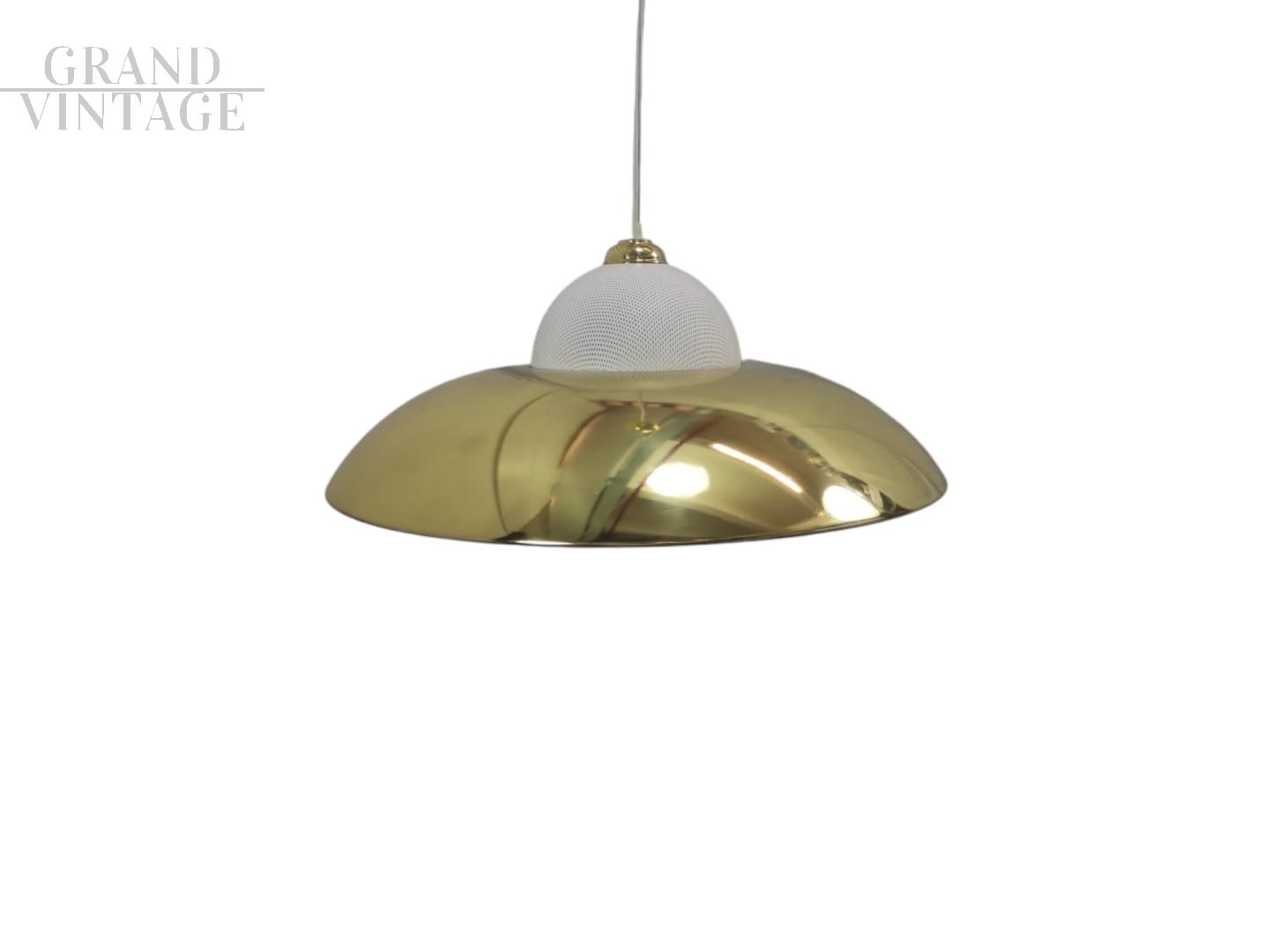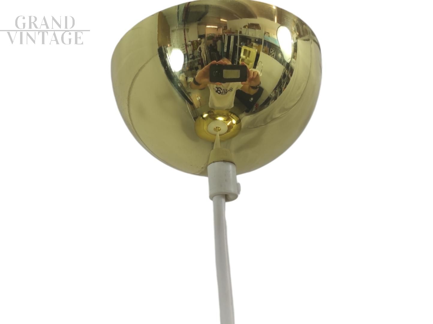 Lampada a sospensione vintage in ottone dorato degli anni '70, in condizioni ottime, presenta un leggero segno sulla coppa segnalato in foto.