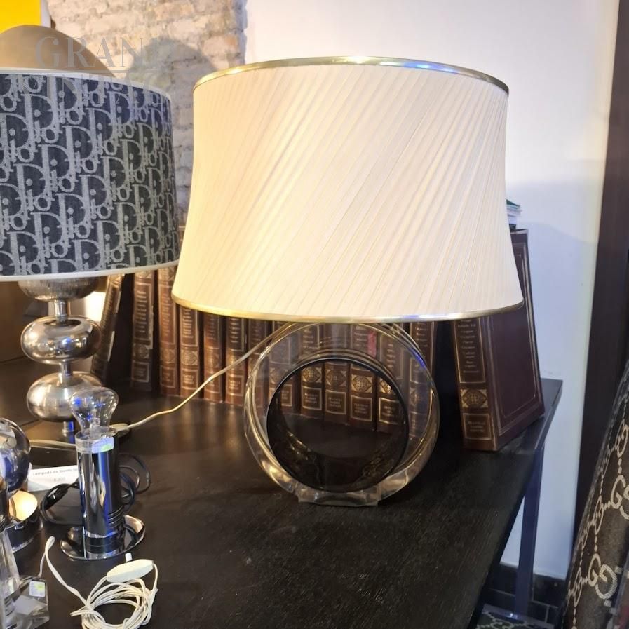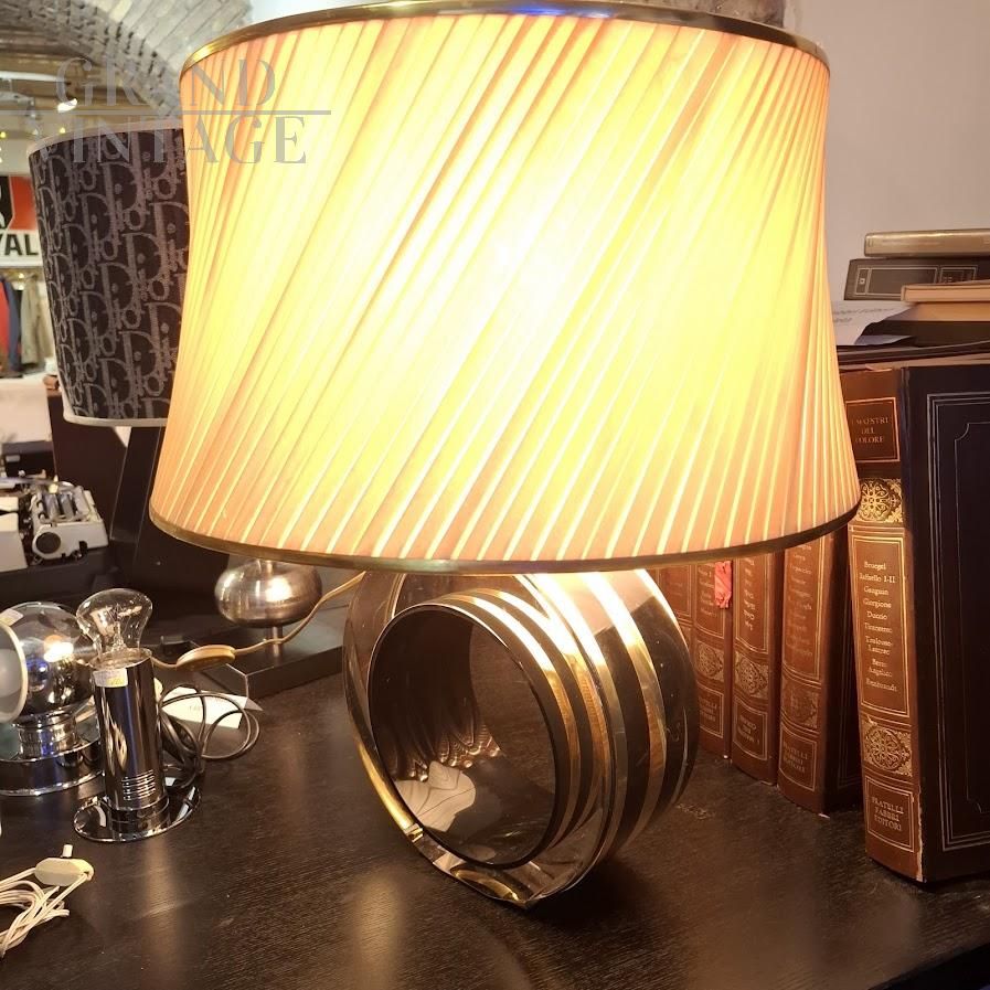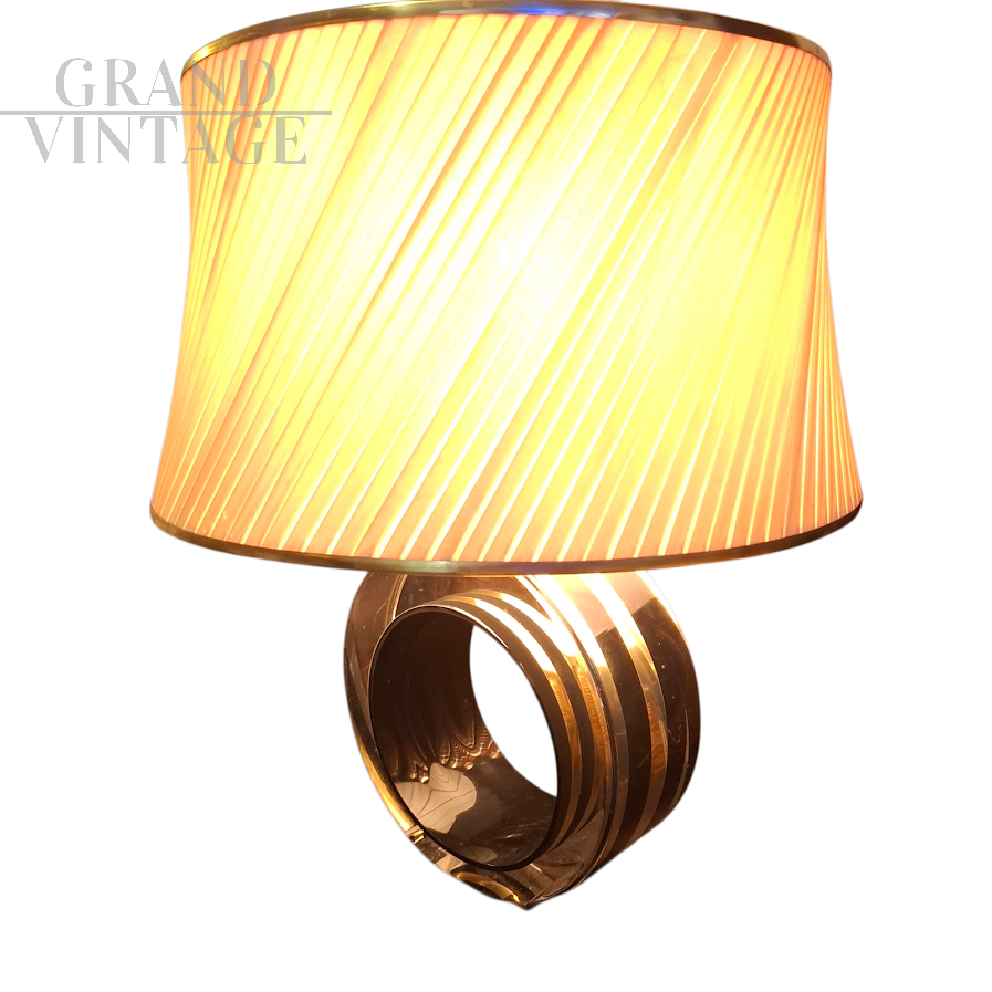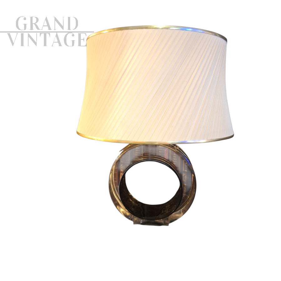 Lampada da tavolo abat-jour realizzata da Smart Italia negli anni '70 con base in plexiglass trasparente decorato da strisce di ottone all'interno, il paralume è in stoffa. In ottime condizioni.