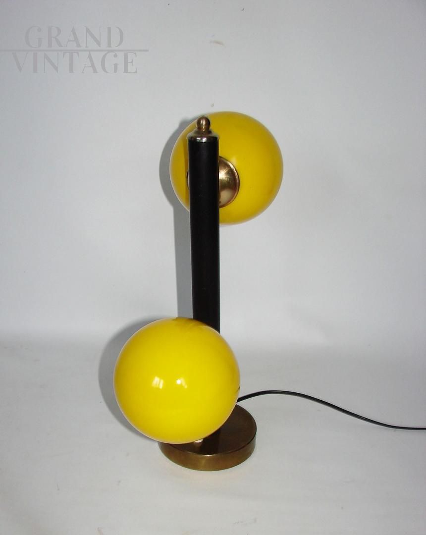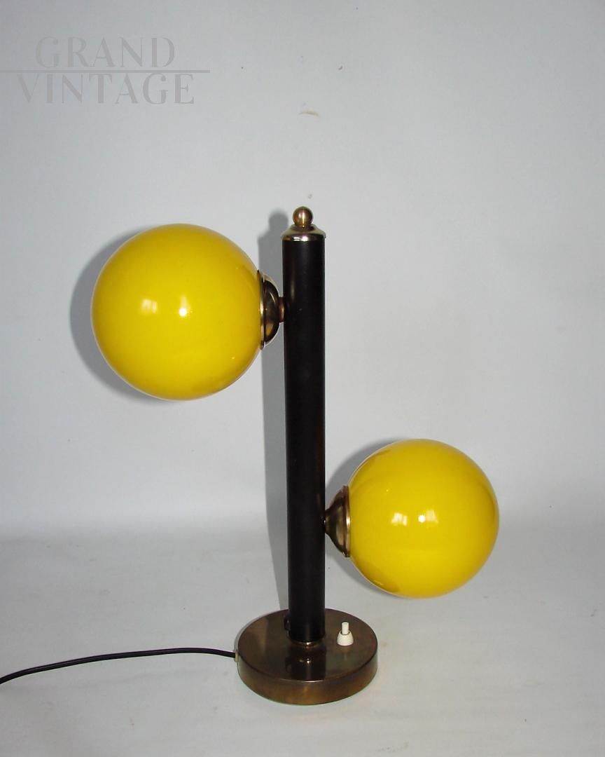 Lampada da scrivania anni '60 in ottone e metallo, con 2 sfere di vetro giallo. La lampada necessita di 2 lampadine E14.