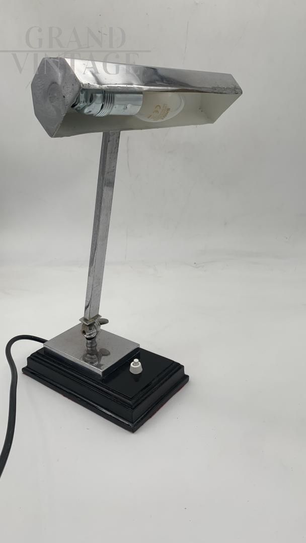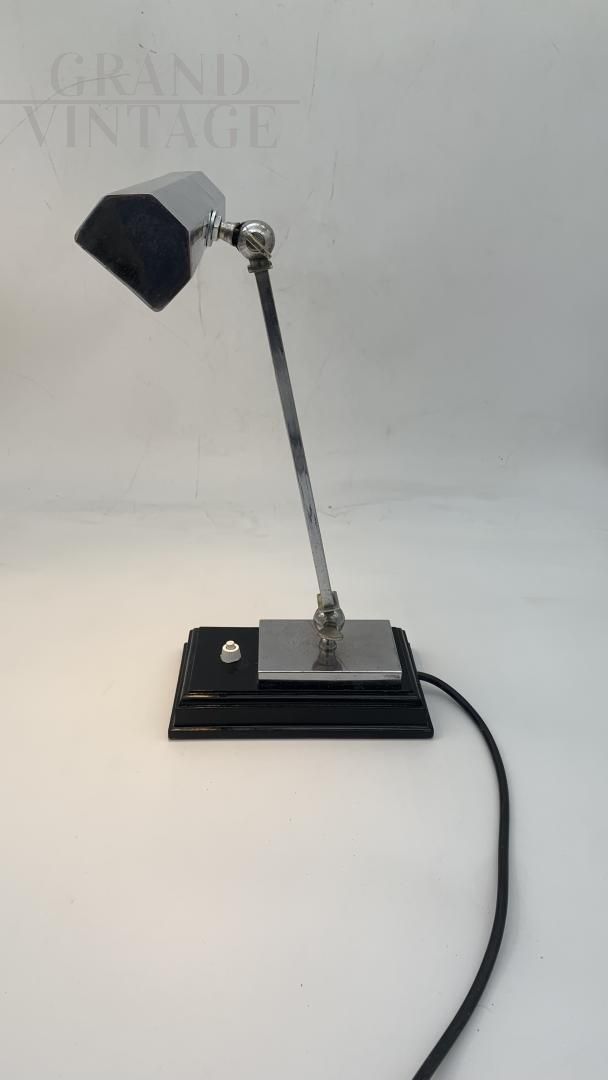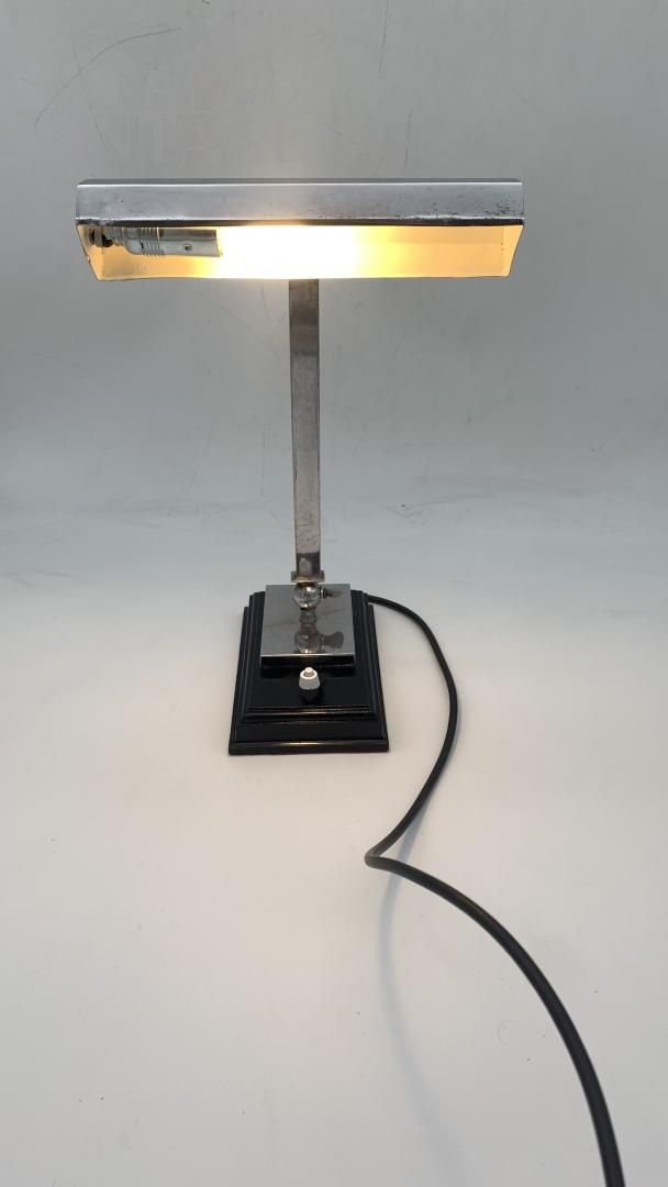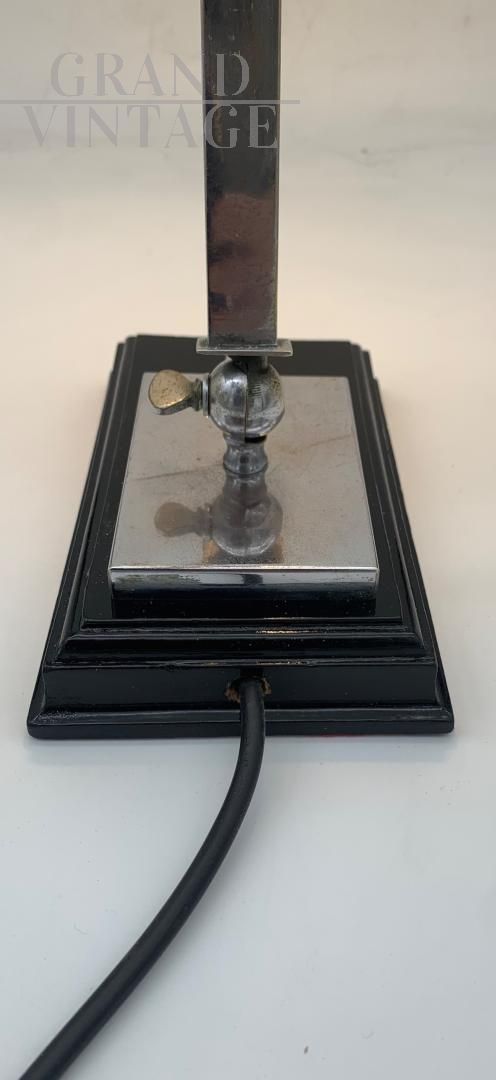Questa lampada da tavolo presenta un design lineare e moderno, con una combinazione elegante di materiali: cromo lucido e base in legno laccato nero. Il corpo della lampada è caratterizzato da uno stelo metallico rettangolare che sostiene un diffusore orizzontale, anch’esso in metallo cromato, con luce direzionata verso il basso, ideale per l'illuminazione da lettura o scrivania. La base, solida e sagomata, conferisce stabilità e un tocco classico al pezzo. È dotata di un interruttore a pulsante posizionato frontalmente per un facile utilizzo. Il cavo di alimentazione nero, con spina italiana da 10 A, è lungo e flessibile, permettendo un posizionamento comodo. La lampada ha 1 portalampada e14. Lampada originale del 1920 circa Dimensioni Altezza: 37 cm Larghezza: 22 cm Profondità: 20