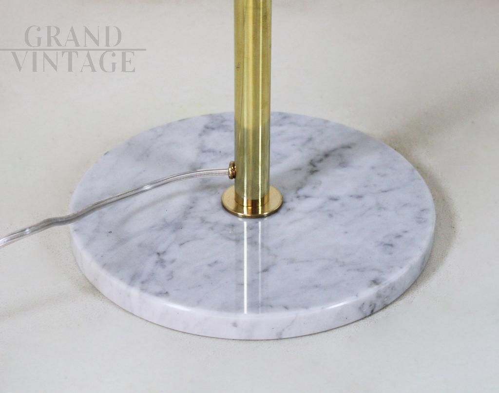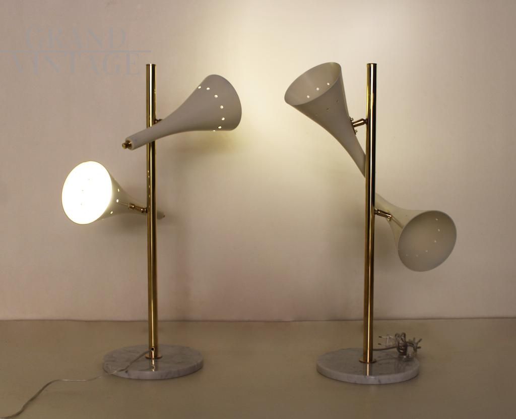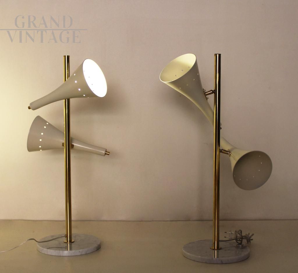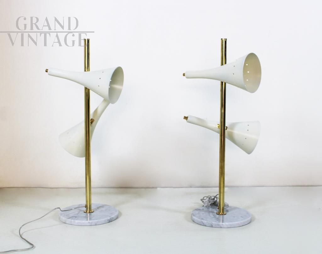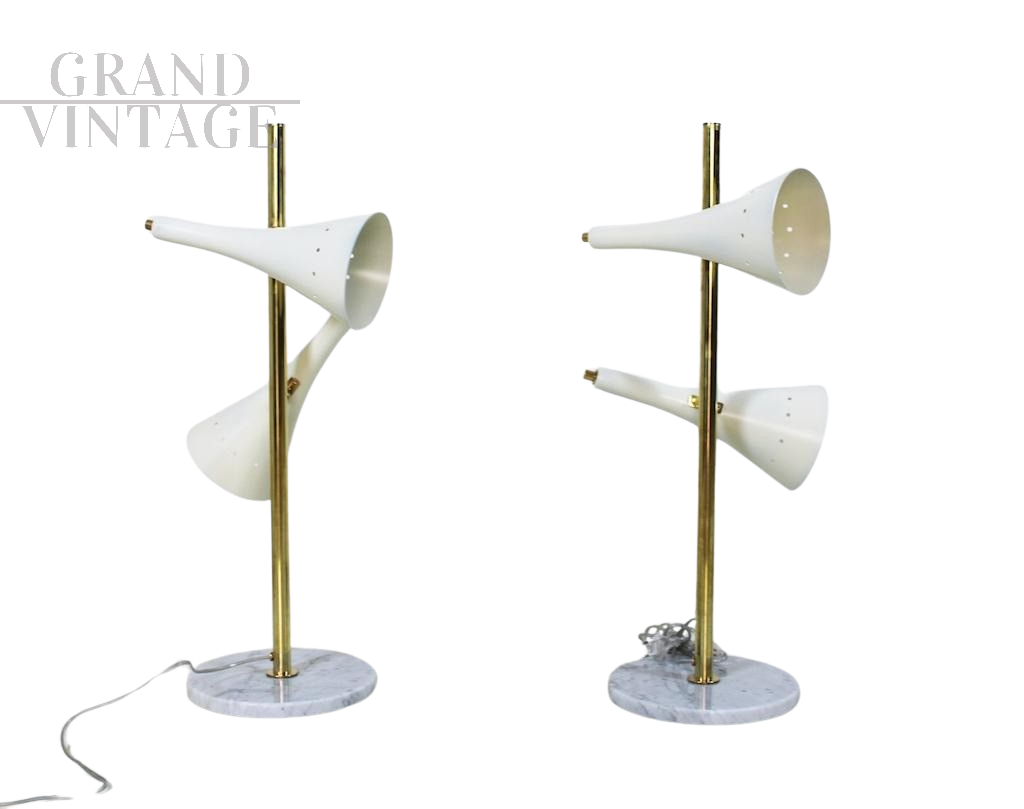 Particolari lampade da tavolo vintage in stile Stilnovo a doppio cono in metallo laccato bianco, con stelo in ottone e base in marmo, Italia anni '70.