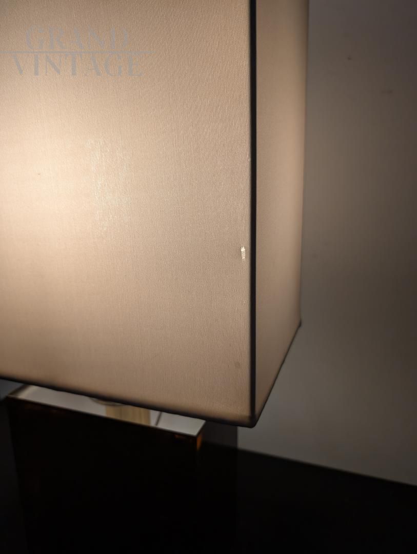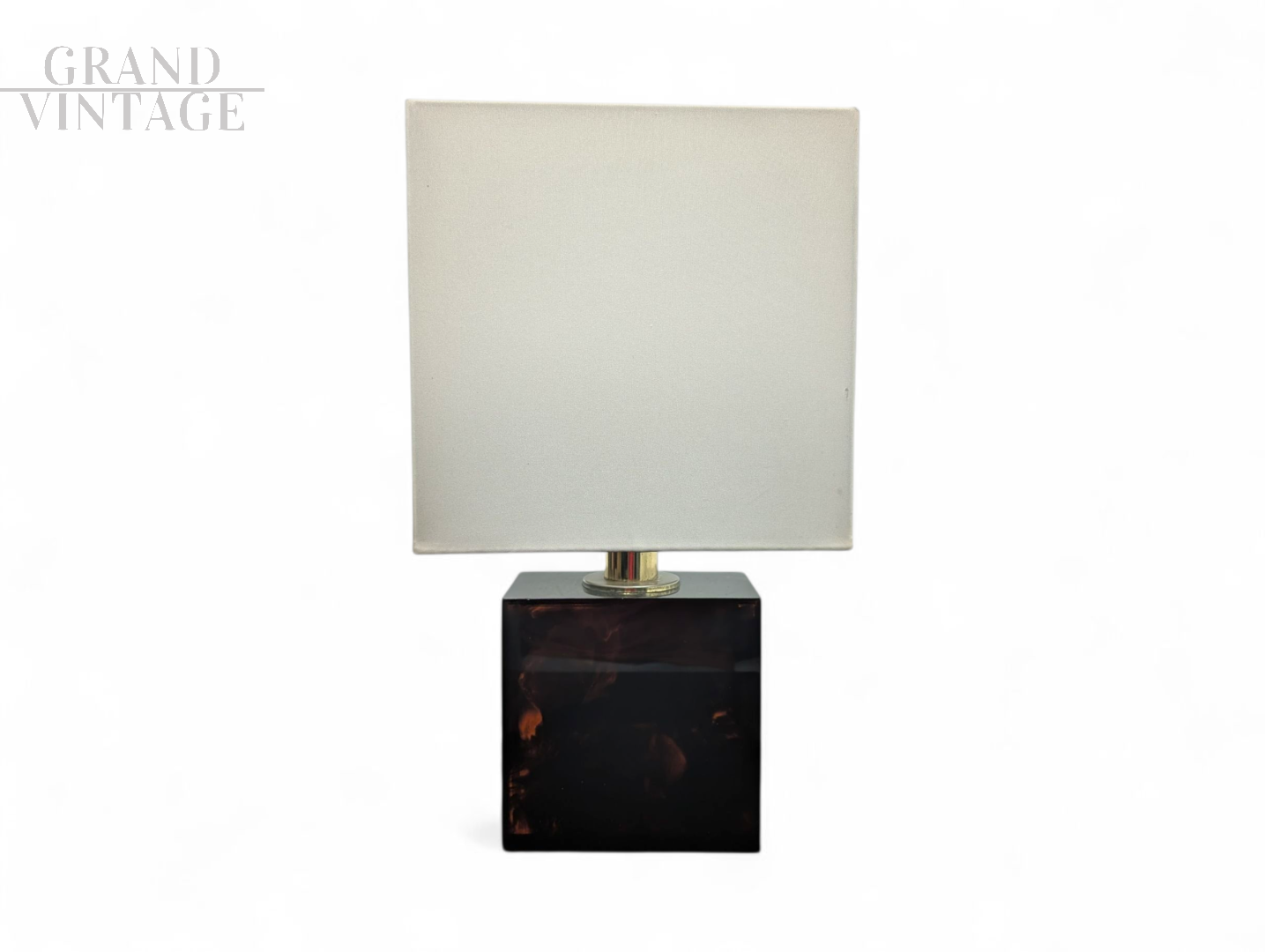 Questa elegante lampada da tavolo unisce design moderno e materiali di qualità. La base è realizzata in resina lucida con una finitura effetto tartarugato nei toni del marrone scuro e nero, con leggere venature ambrate che aggiungono profondità e raffinatezza. La forma cubica della base conferisce un aspetto solido e contemporaneo. Quando accesa, la lampada emette una luce soffusa che valorizza le texture del paralume e riflette delicatamente sulla base scura, creando un piacevole contrasto visivo. Un piccolo difetto è visibile sul lato del paralume (una lieve abrasione del tessuto), che però non compromette la funzionalità o l’estetica generale del pezzo.