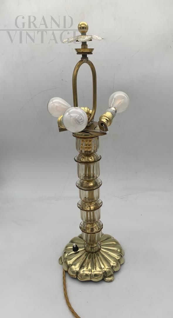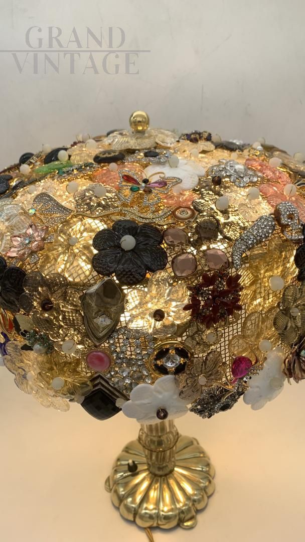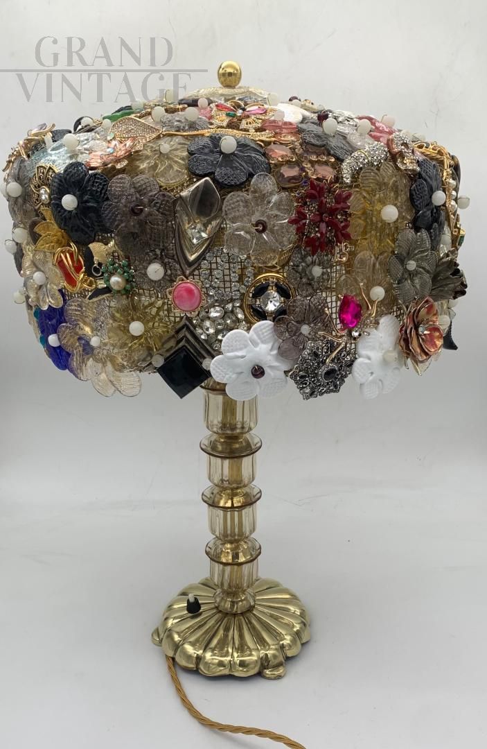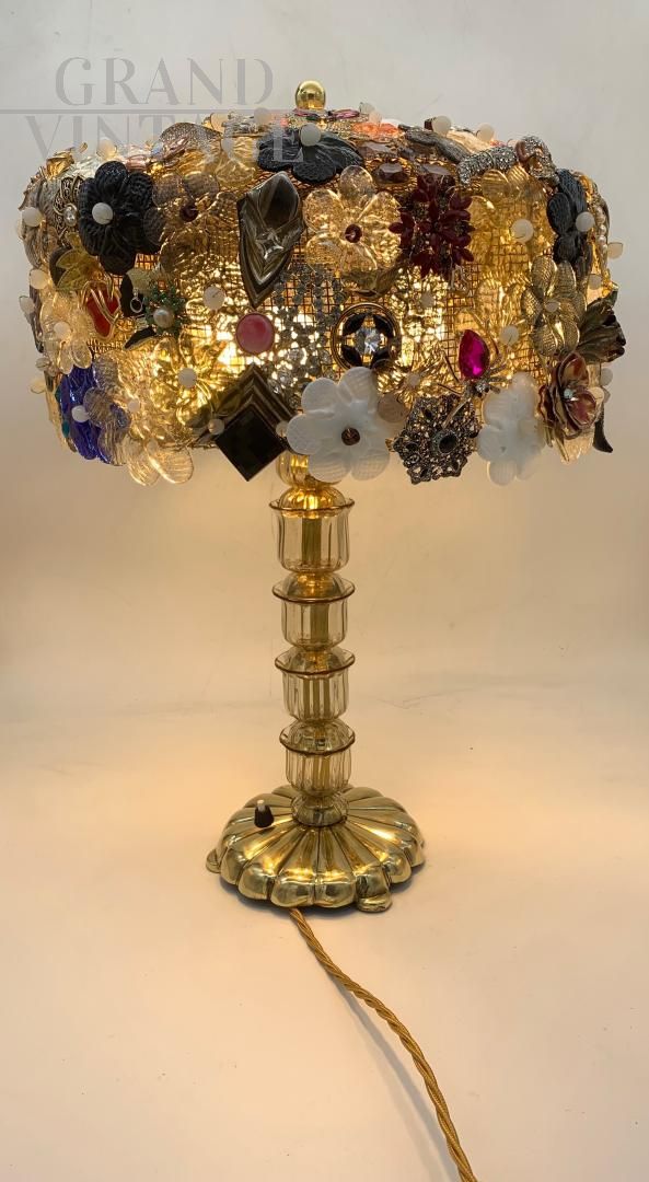 Lampada da tavolo, singola. Opera d'arte creata dallo storico artigiano della nostra ditta. Il cappello della lampada è stato creato con tanti oggetti d'epoca e di valore. Gran parte degli oggetti che fan parte del cappello della lampada sono artigianali. L'asta e la base sono degli anni '50, base in bronzo asta decorata con diversi moduli in vetro di murano. Naturalmente l'impianto elettrico è nuovo formato da 3 portalampada e 14. Dimensioni Altezza 58 cm Larghezza 33 cm