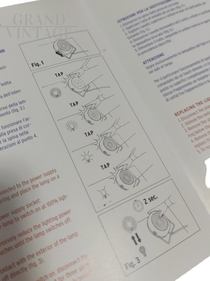 E' l'evoluzione del progetto con Flos del 1966, divenuto, per la sua universalità d'uso, un "giocattolo per grandi". Sciuko 2000 è il risultato dell'incontro tra Castiglioni, che ama giocare con la luce e L'Enel che ama lavorare con il design. La particolarità di questa lampada è proprio l'accensione e la modalità di cambio tonalità di luce. Si accende toccando qualsiasi parte della lampada per almeno 2 secondi e si cambia tonalità con un piccolo tap. Sono disponibili 4 tonalità di luce come è evidenziato nelle foto. Infine, le condizioni sono eccellenti. Cablaggio elettrico originale. Se si è amanti di lampade di design, questa fa proprio al caso vostro.
