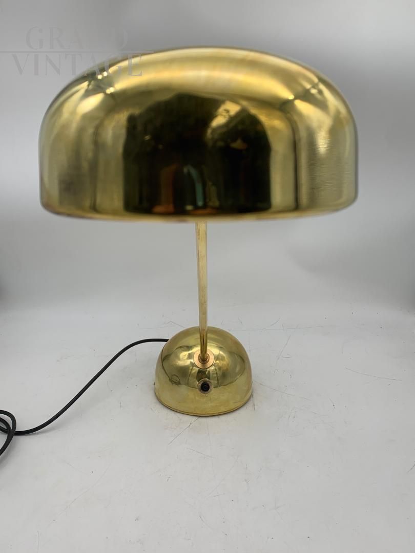 Lampada da tavolo in ottone lucido con struttura inclinata a braccio singolo rigido, base semisferica stabile con interruttore integrato, paralume bombato a forma di disco piatto con apertura inferiore per luce diretta, design minimalista e funzionale dallo stile vintage-industriale, luce calda diffusa ideale per scrivania o lettura.