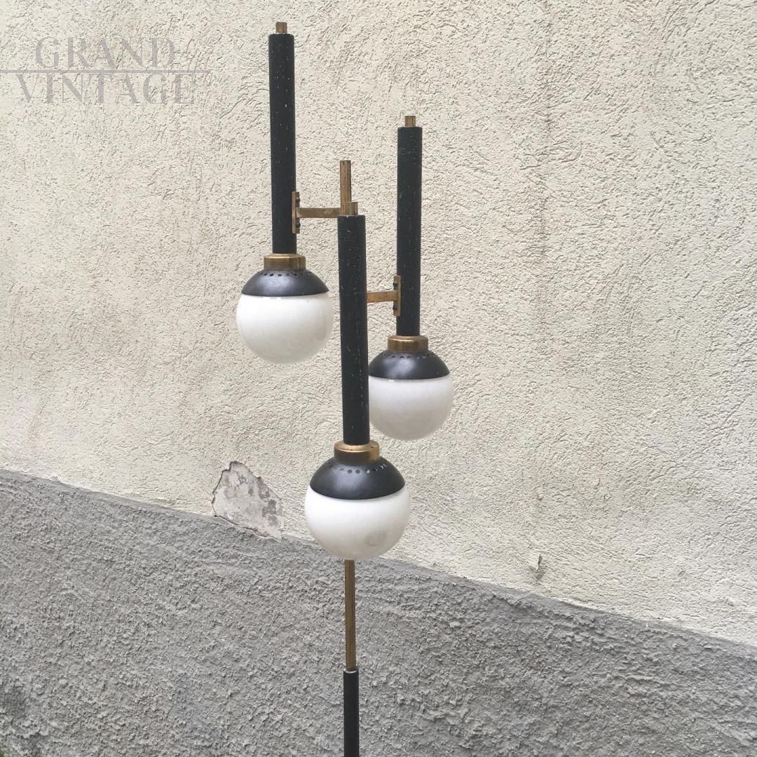 Questa lampada da terra vintage, in metallo verniciato, ottone e 3 piccoli globi di vetro è nel tipico stile italiano di metà del secolo. Base tonda in marmo, interruttore a pedale.