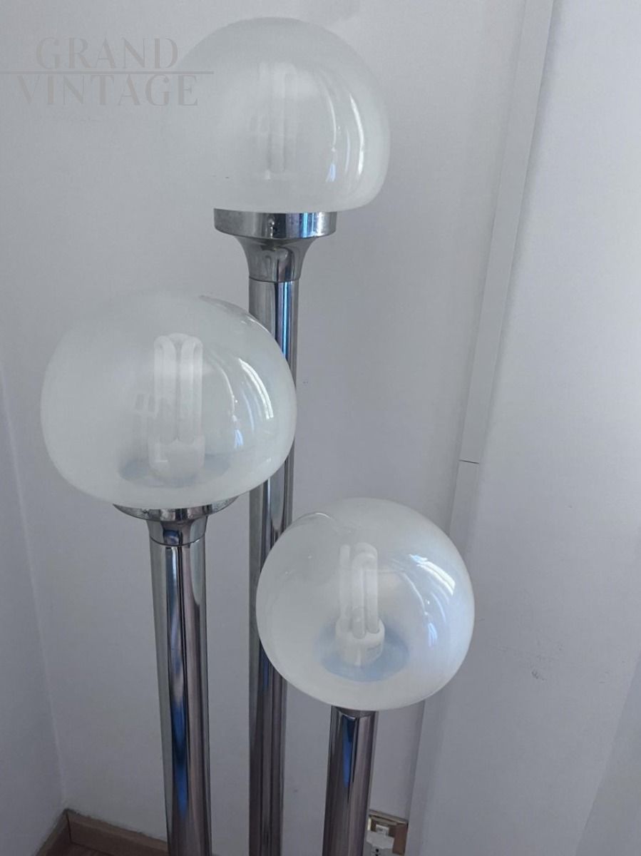 Lampada da terra piantana italiana vintage a tre luci in stile Carlo Nason, con struttura in acciaio cromato e globi in vetro di Murano realizzati da Mazzega, anno di produzione 1960/1969. Cavo originale, non si riscontrano difetti, molto ben conservata e funzionante. Altezza 145 cm, diametro 40 cm.