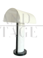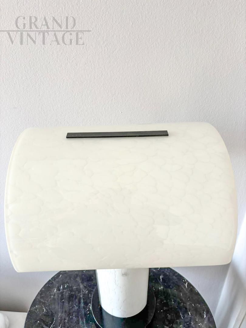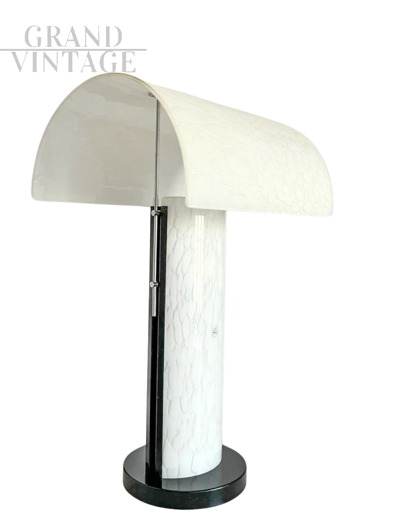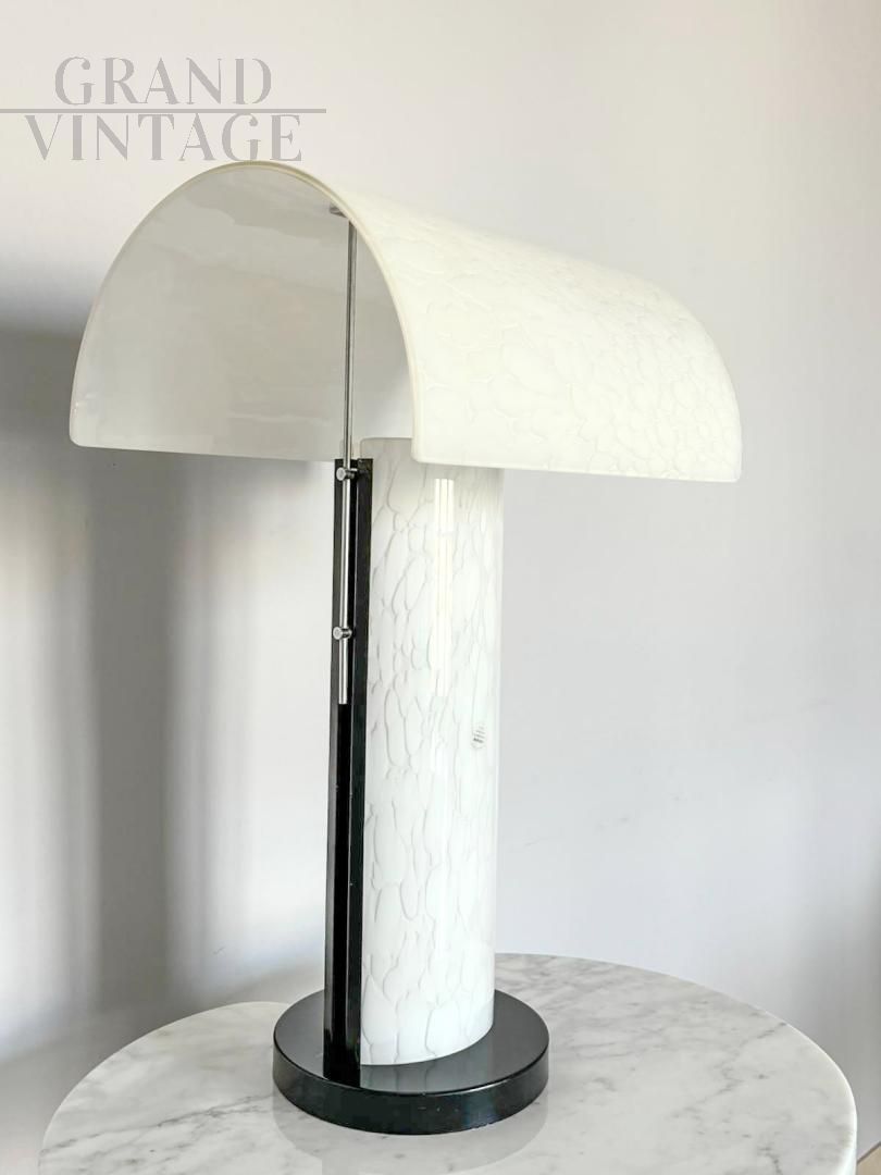 Lampada da tavolo design in vetro di Murano firmata Zonca, Italia anni '80, dalla linea moderna, interamente lavorata in vetro di Murano di colore bianco. Le interpretazioni dei disegni di lavorazione possono essere diverse: a seconda della fantasia possono essere nuovle, sassi, disegni astratti. La lampada si regge su una base metalica laccata di colore nero. In ottimo stato di conservazione.