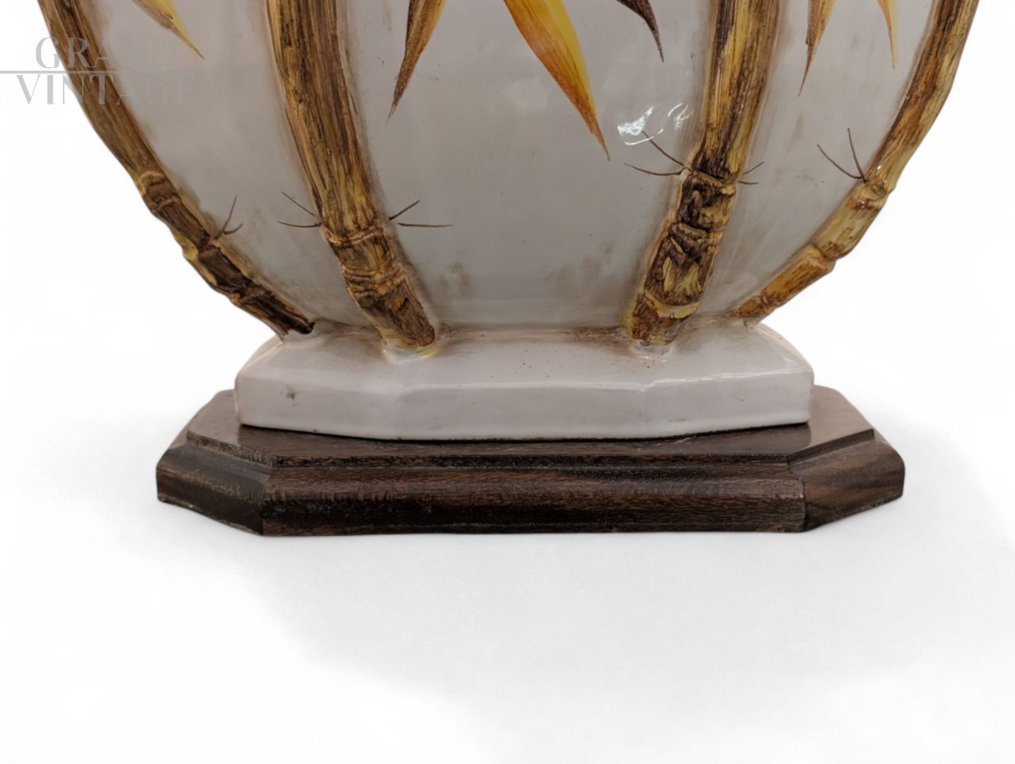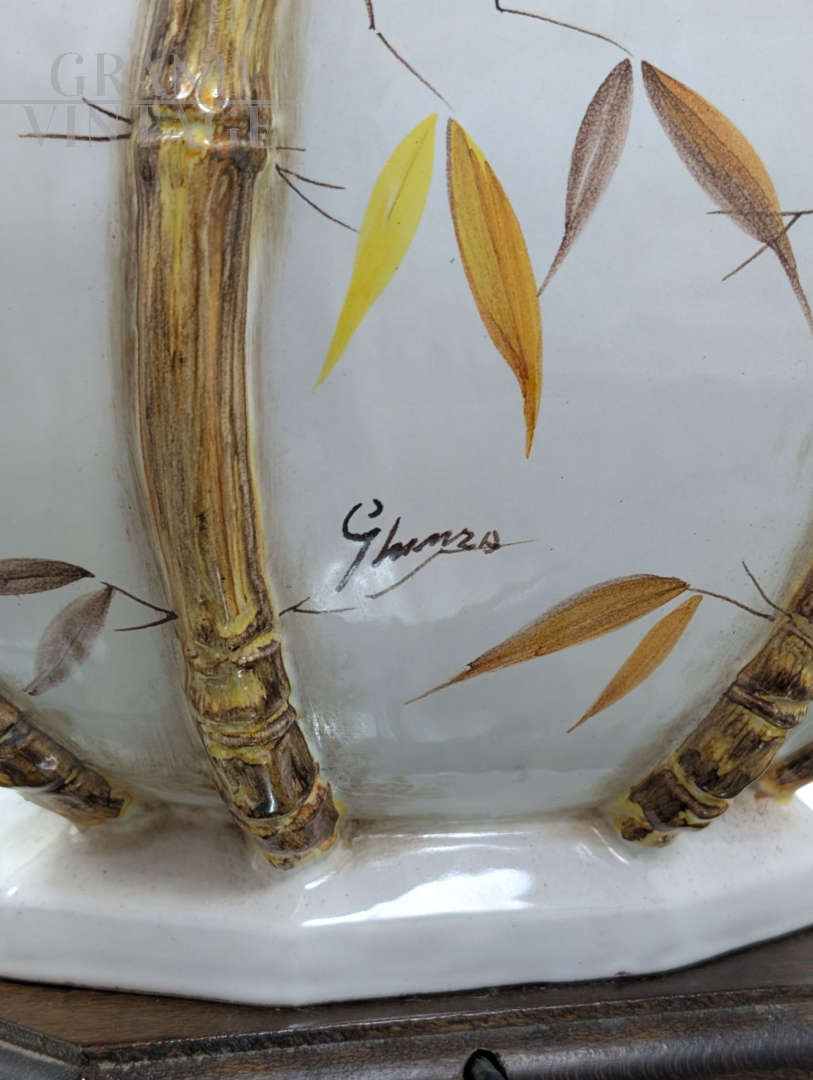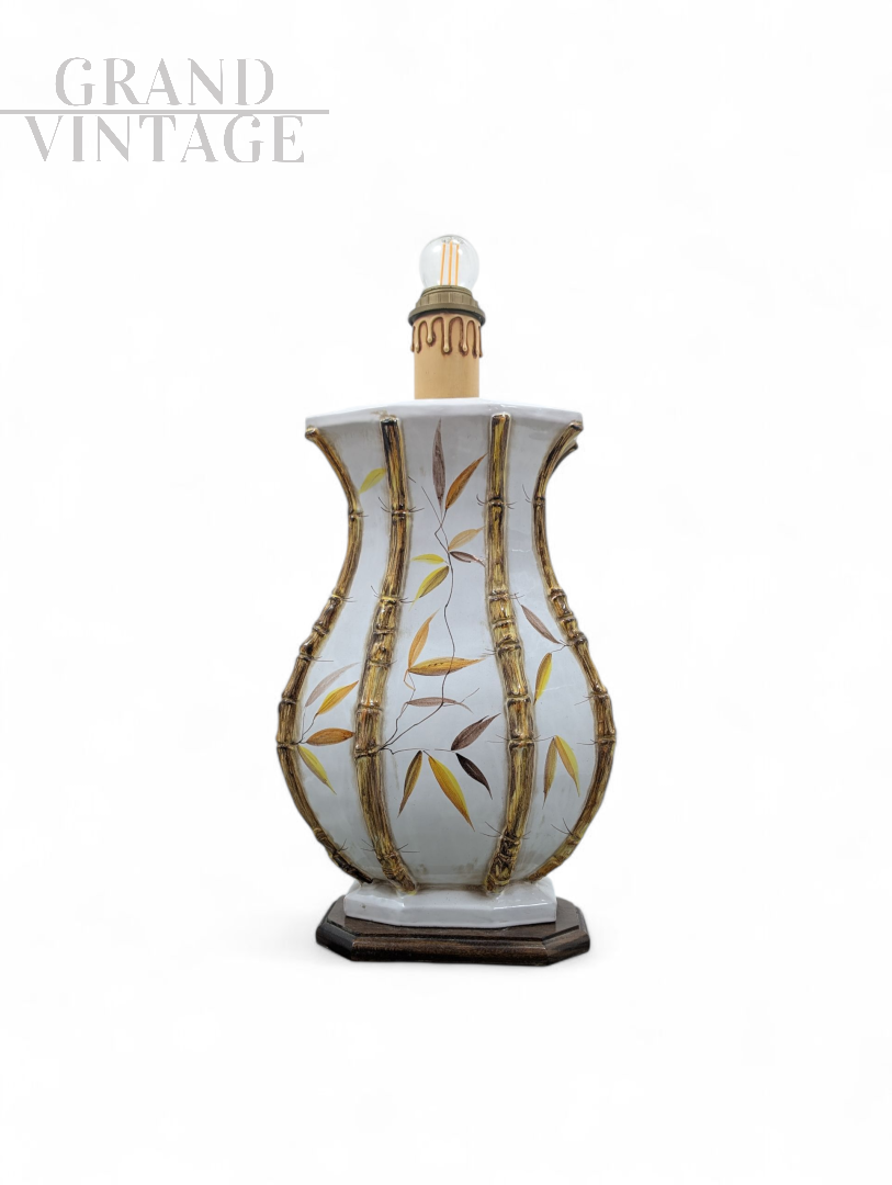 Lampada da tavolo in ceramica decorata a mano con motivo di bambù e foglie stilizzate. La base della lampada ha una forma bombata a bulbo, suddivisa da rilievi che imitano canne di bambù, accentuando l’effetto tridimensionale e naturale del design. Il corpo ceramico è smaltato in bianco lucido, decorato con foglie in tonalità autunnali – giallo, marrone e ocra – dipinte con cura artigianale. Firmata "Ghinza" sul corpo della lampada, testimonianza del lavoro manuale dell’artista. La lampada poggia su una base esagonale in legno scuro e presenta un portalampada in stile classico con effetto "colata" dorata. Viene fornita con una lampadina decorativa a filamento LED, che ne esalta l’eleganza anche da accesa.