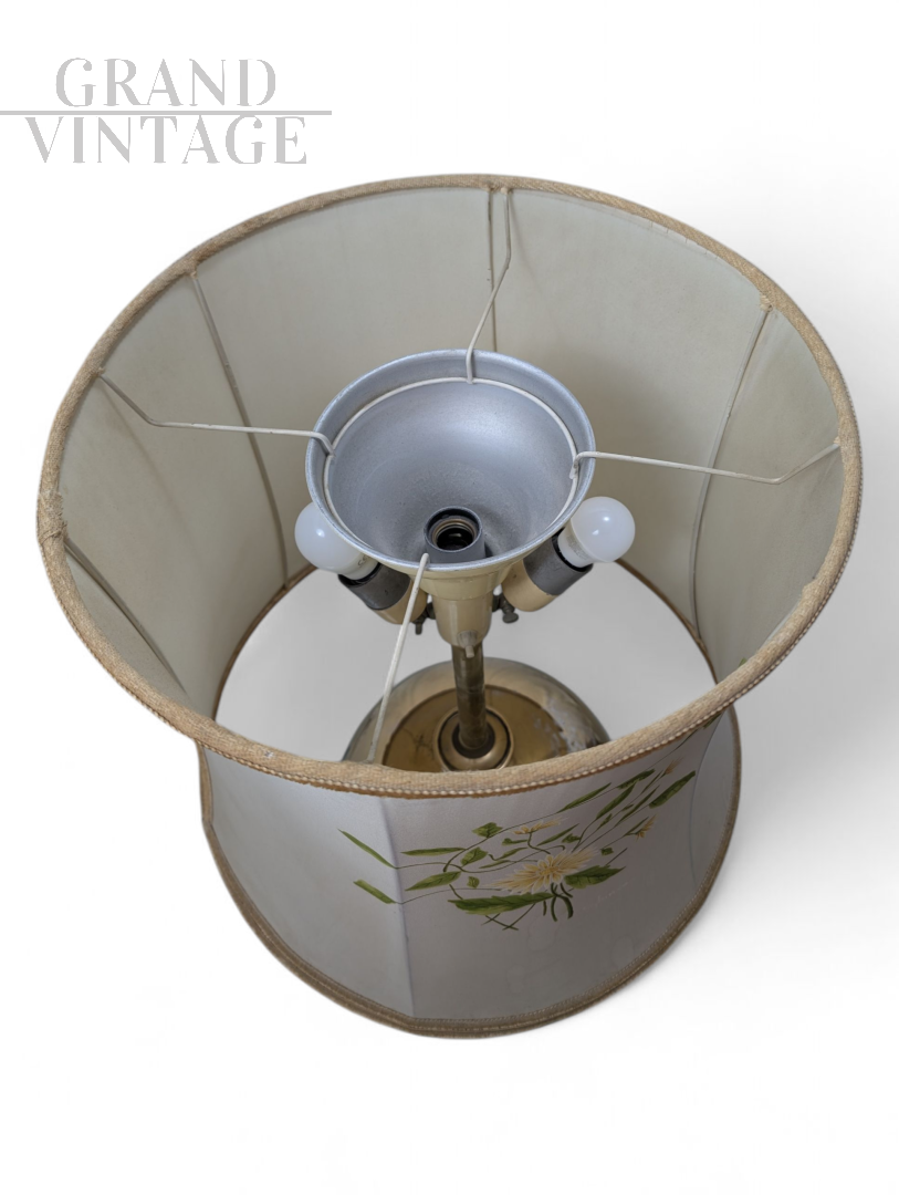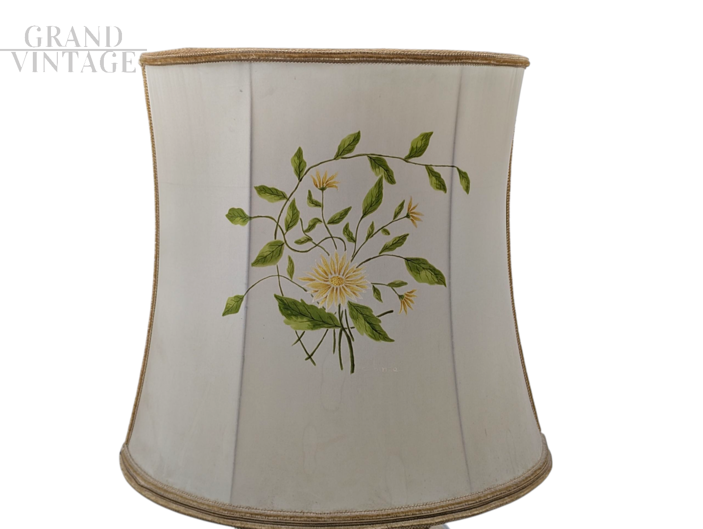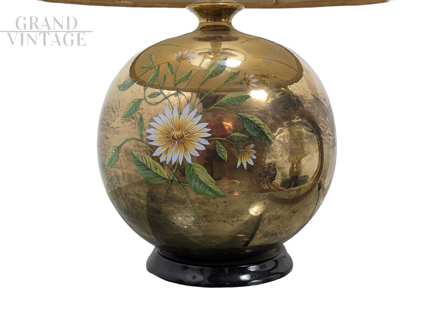 Questa elegante lampada da tavolo unisce l'artigianato artistico a uno stile vintage raffinato. La base della lampada è sferica, in ceramica dorata specchiata con finitura lucida e riflettente. Su di essa è dipinto a mano un delicato motivo floreale che raffigura margherite bianche con dettagli gialli e foglie verdi, aggiungendo un tocco naturale e romantico al design. Il paralume in tessuto chiaro ha una forma leggermente svasata e presenta anch’esso una decorazione floreale coordinata, dipinta a mano. Al centro spicca una grande margherita gialla circondata da foglie verdi e boccioli, con la firma "Ghinza" visibile sotto il decoro, indice di lavorazione artistica e autenticità.