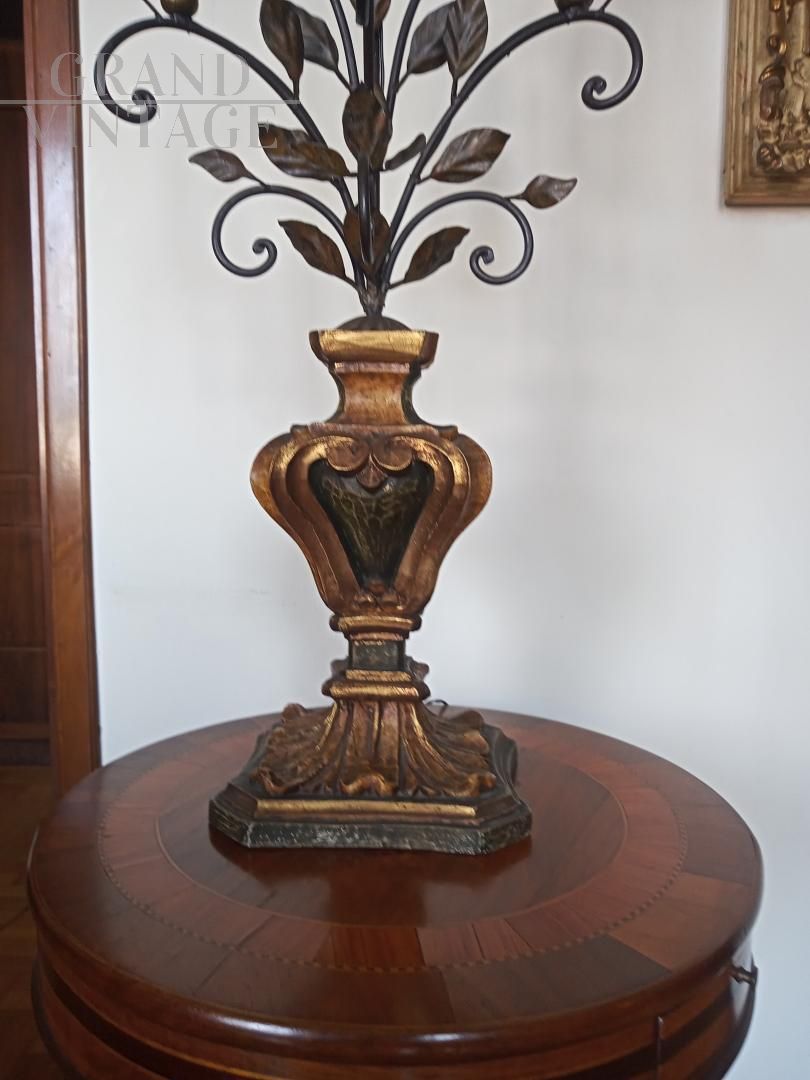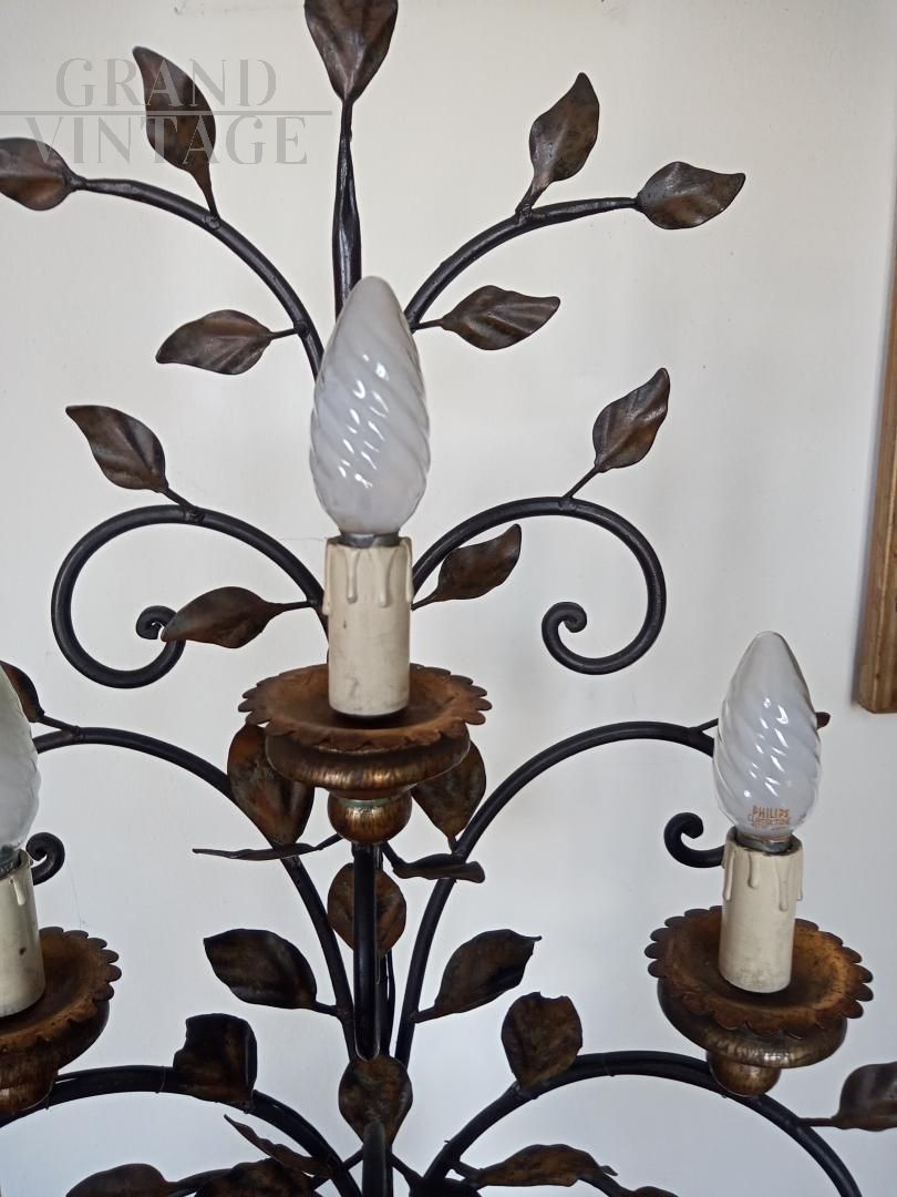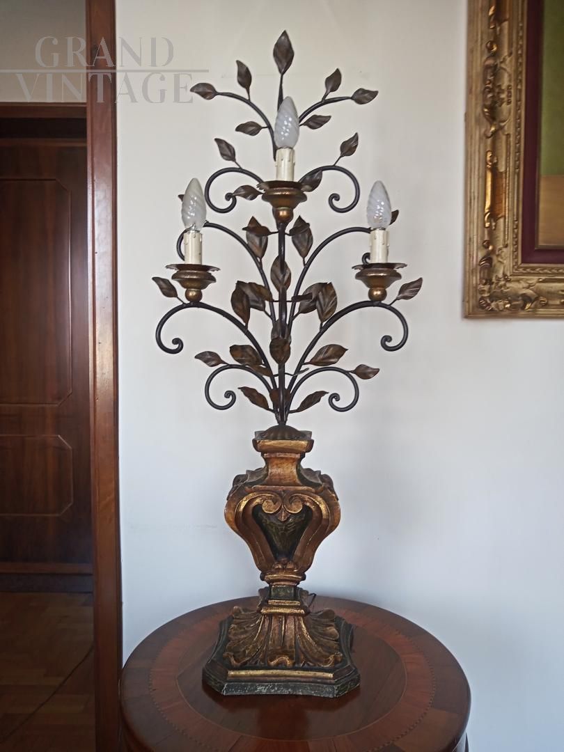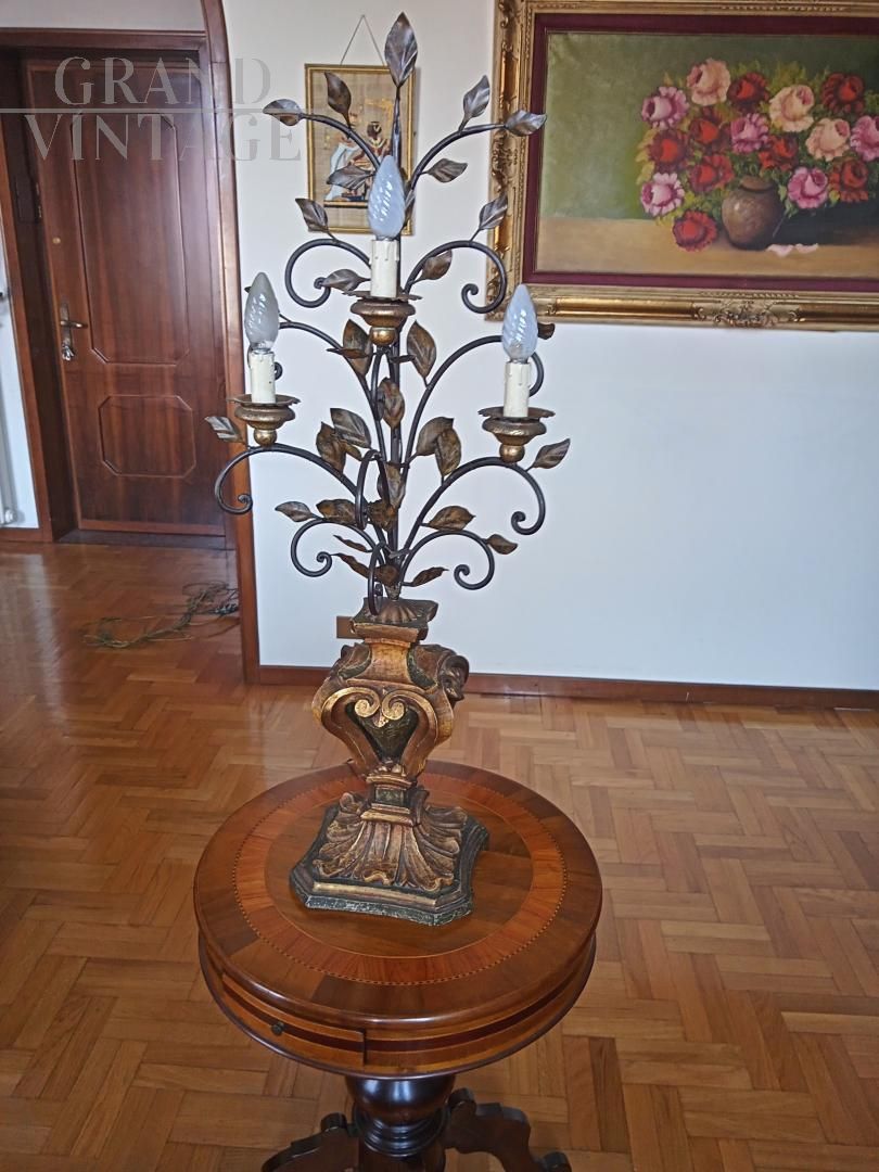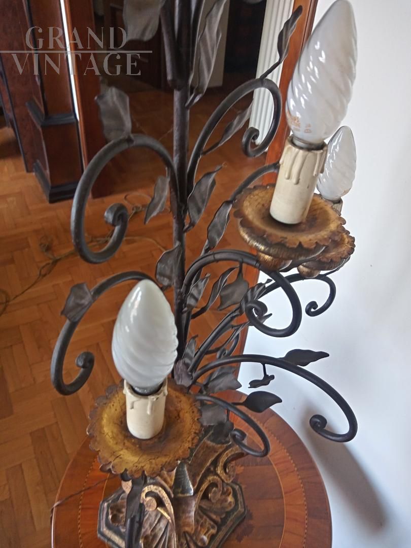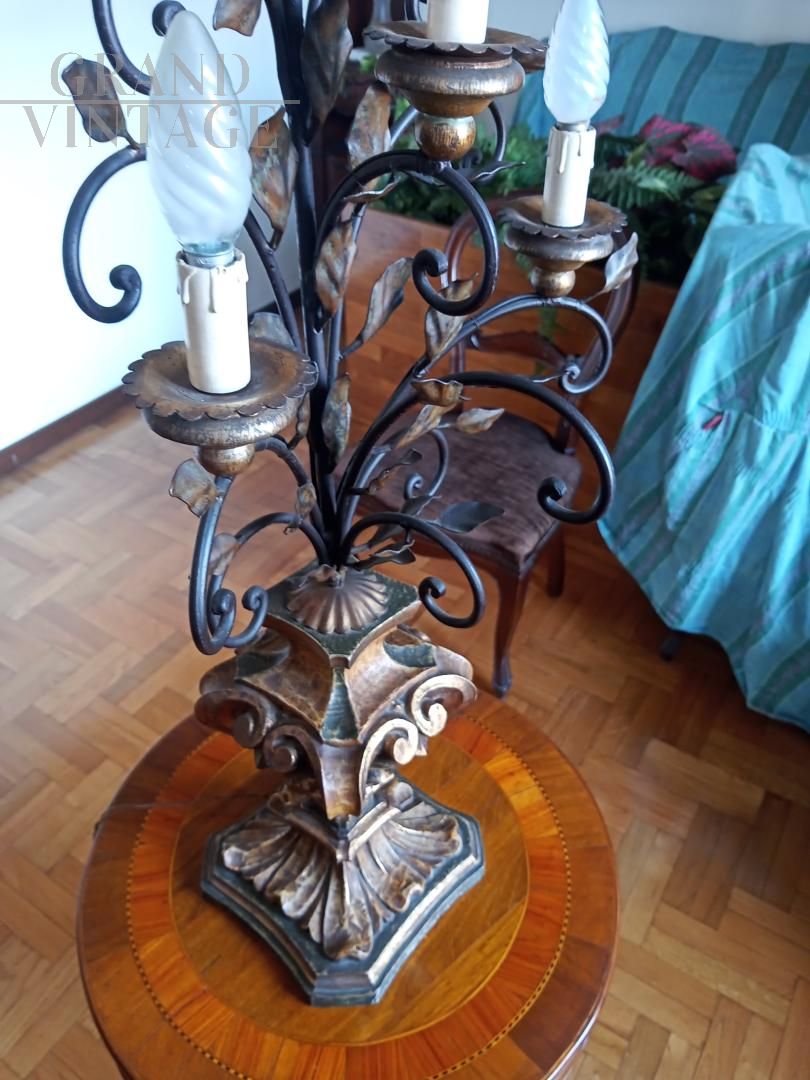 Lampada torciere con base in legno intagliato e dipinto in stile toscano, la parte superiore con portalume a tre luci è in ferro battuto e lamierino riccamente lavorati a foglie e fiori dipinti a mano e dorati. Prodotto artigianale italiano della metà del XX secolo, questa lampada è perfetta per arredare un angolo di arredo sia moderno che in stile. In ottime condizioni, non necessita di nessun intervento o restauro. Impianto elettrico portalampade attacco piccolo perfettamente funzionante.
