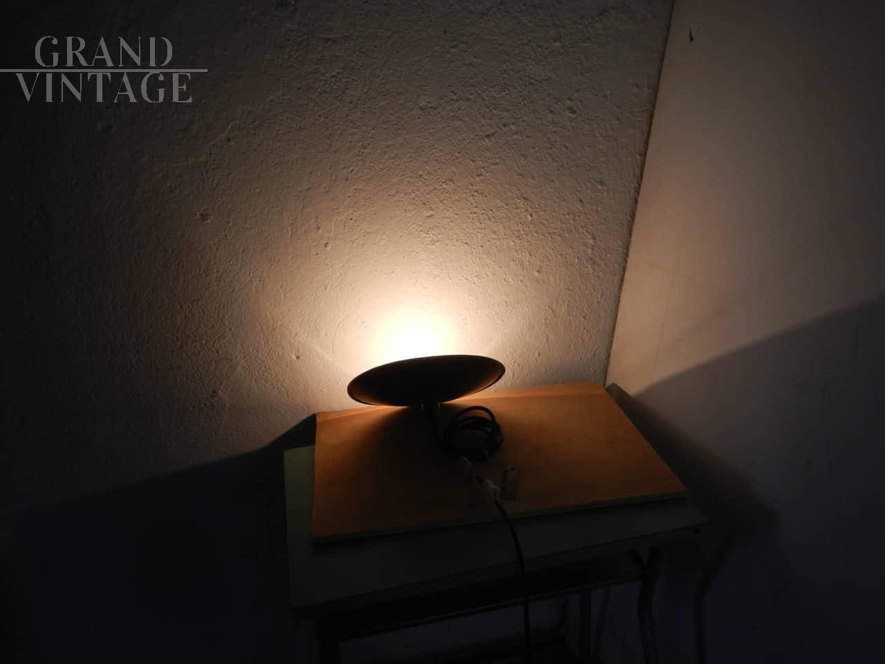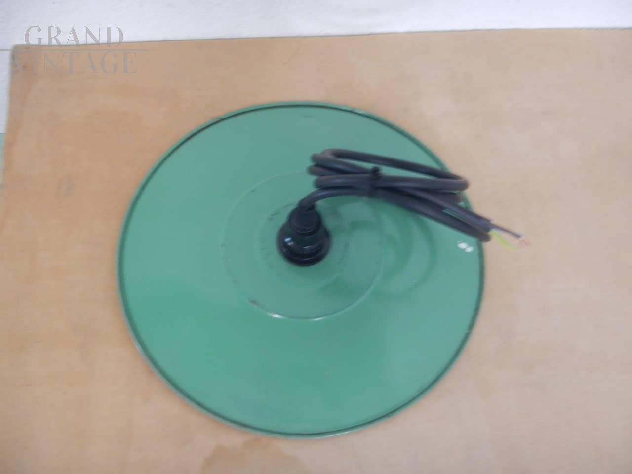 Lampada industriale francese a piattino in metallo verde chiaro con interno bianco, impianto elettrico rifatto con attacco per lampadina E14. In buone condizioni con segni d’uso.