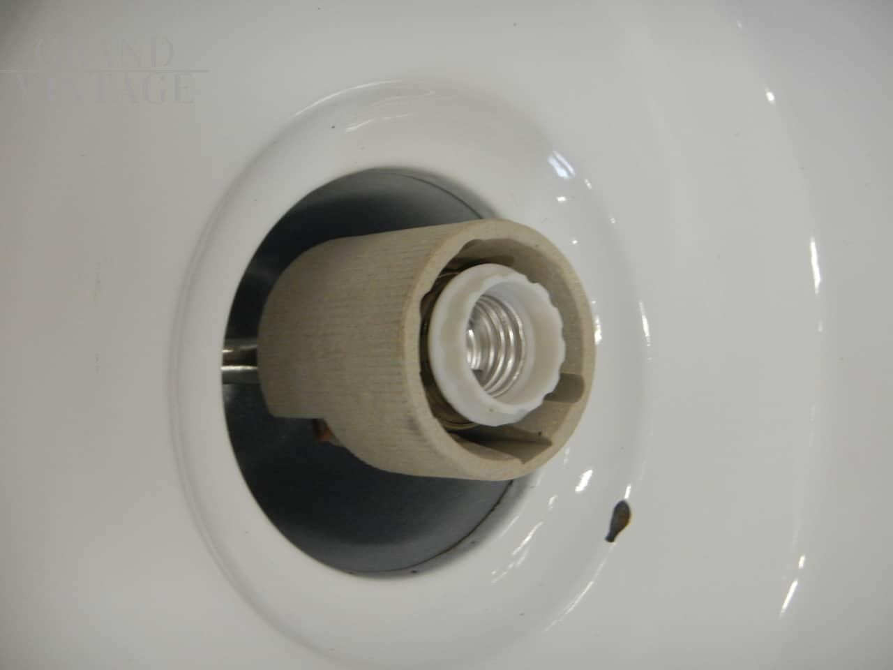 Lampada a sospensione industriale vintage in metallo nero con interno bianco, gancio in ceramica, diametro di 50 cm. Impianto funzionante con attacco per lampadina di tipo E27. Presenta i naturali segni d’uso.CD988B