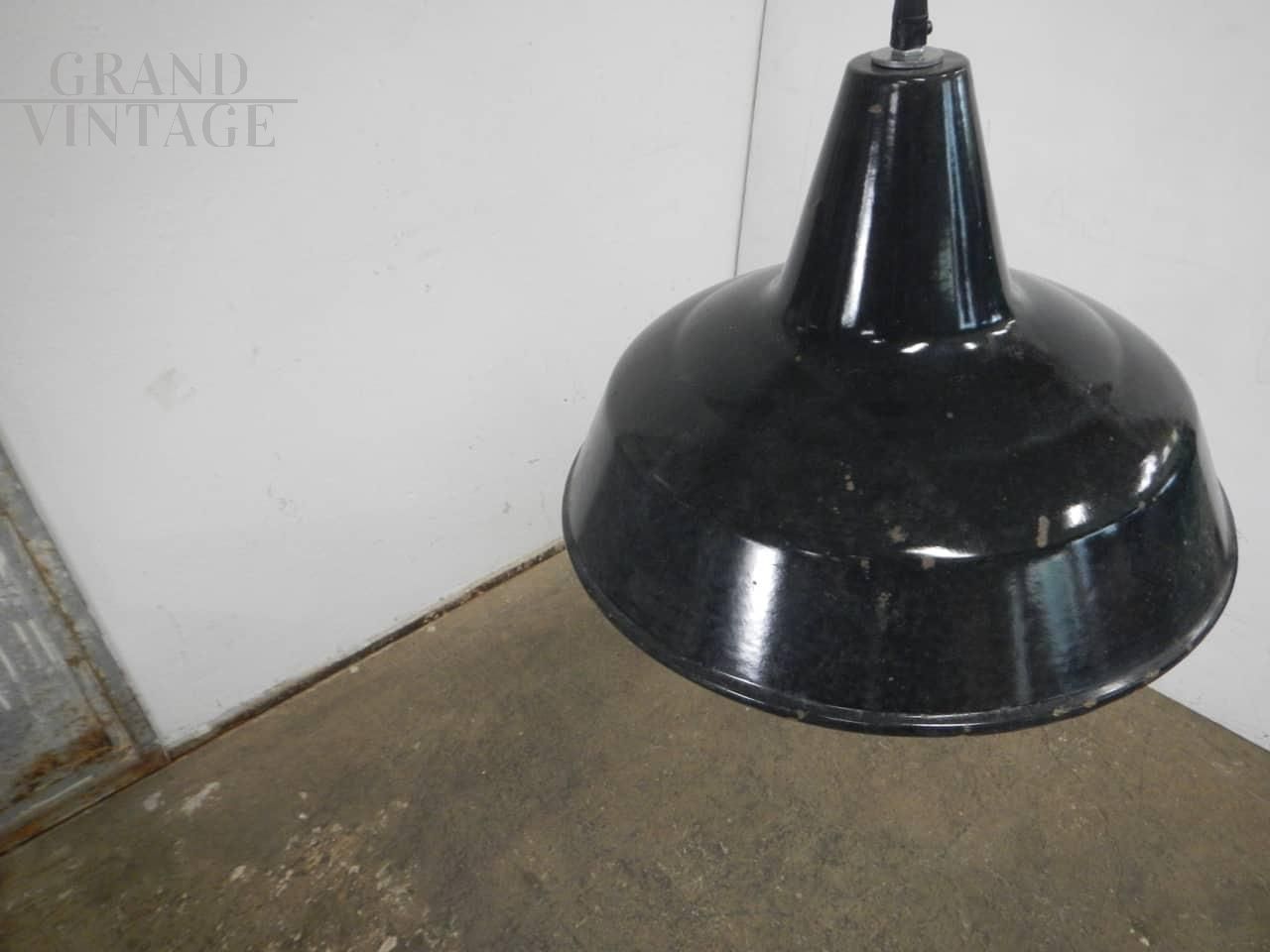 Lampada industriale a sospensione a imbuto in metallo nero con interno bianco con diametro 34 cm, anni '40, impianto elettrico con attacco per lampadina E27. In buone condizioni.