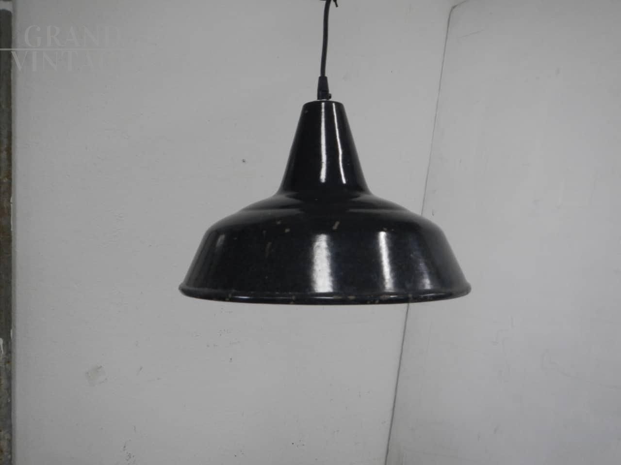 Lampada industriale a sospensione a imbuto in metallo nero con interno bianco, anni '40, diametro 40 cm, impianto elettrico ricablato e funzionante, attacco per lampadina E27. In buone condizioni.