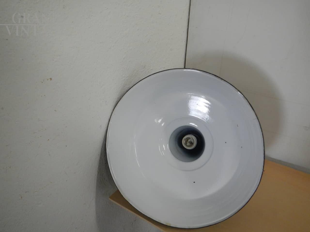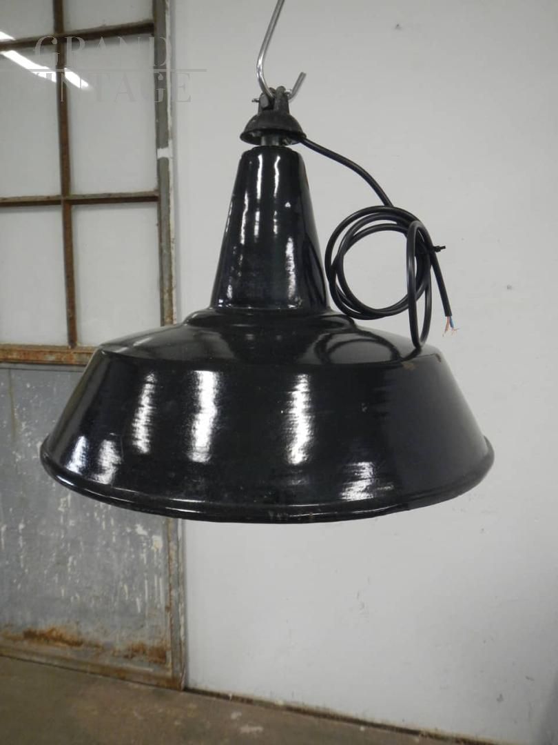 Lampada industriale a sospensione a imbuto in metallo nero con interno bianco, anni '40, diametro 40 cm, impianto elettrico ricablato e funzionante, attacco per lampadina E27. In buone condizioni.