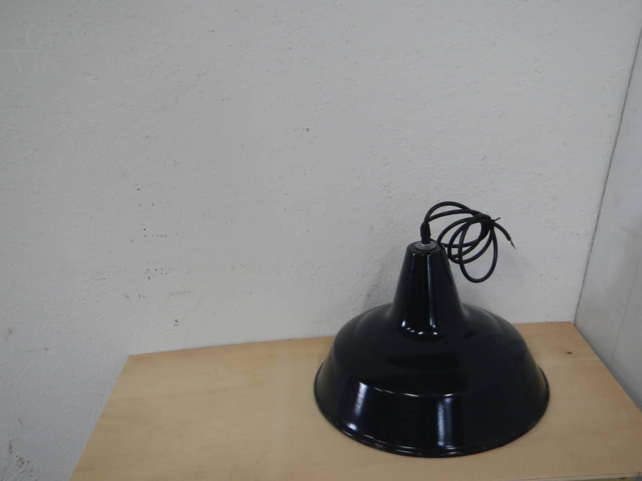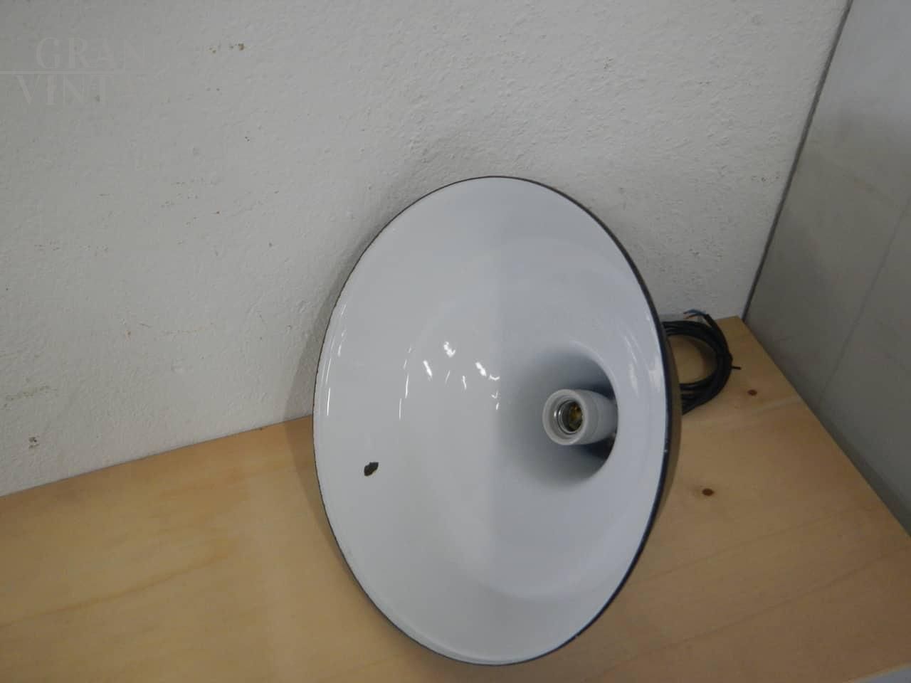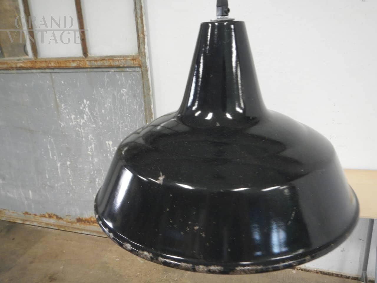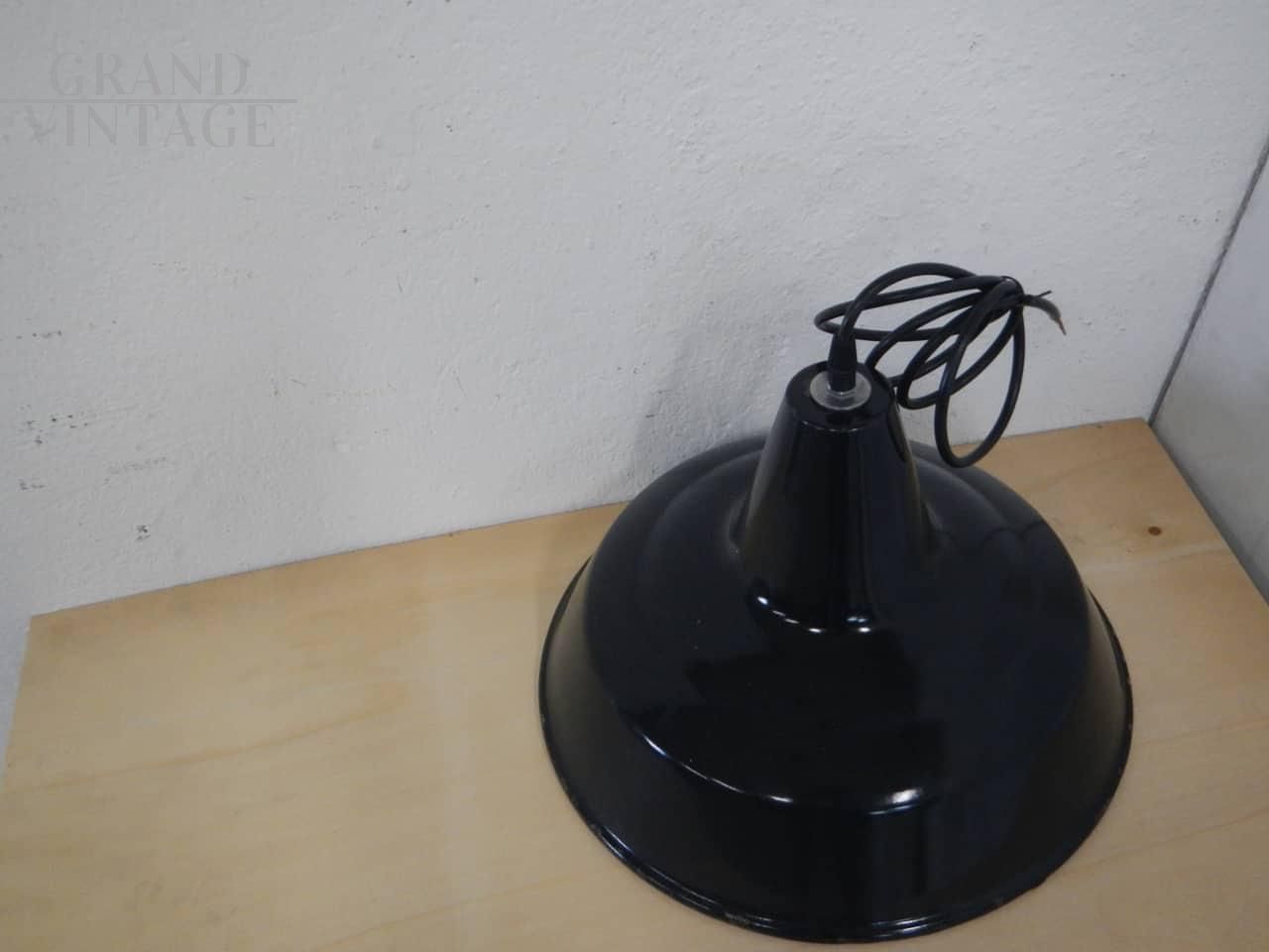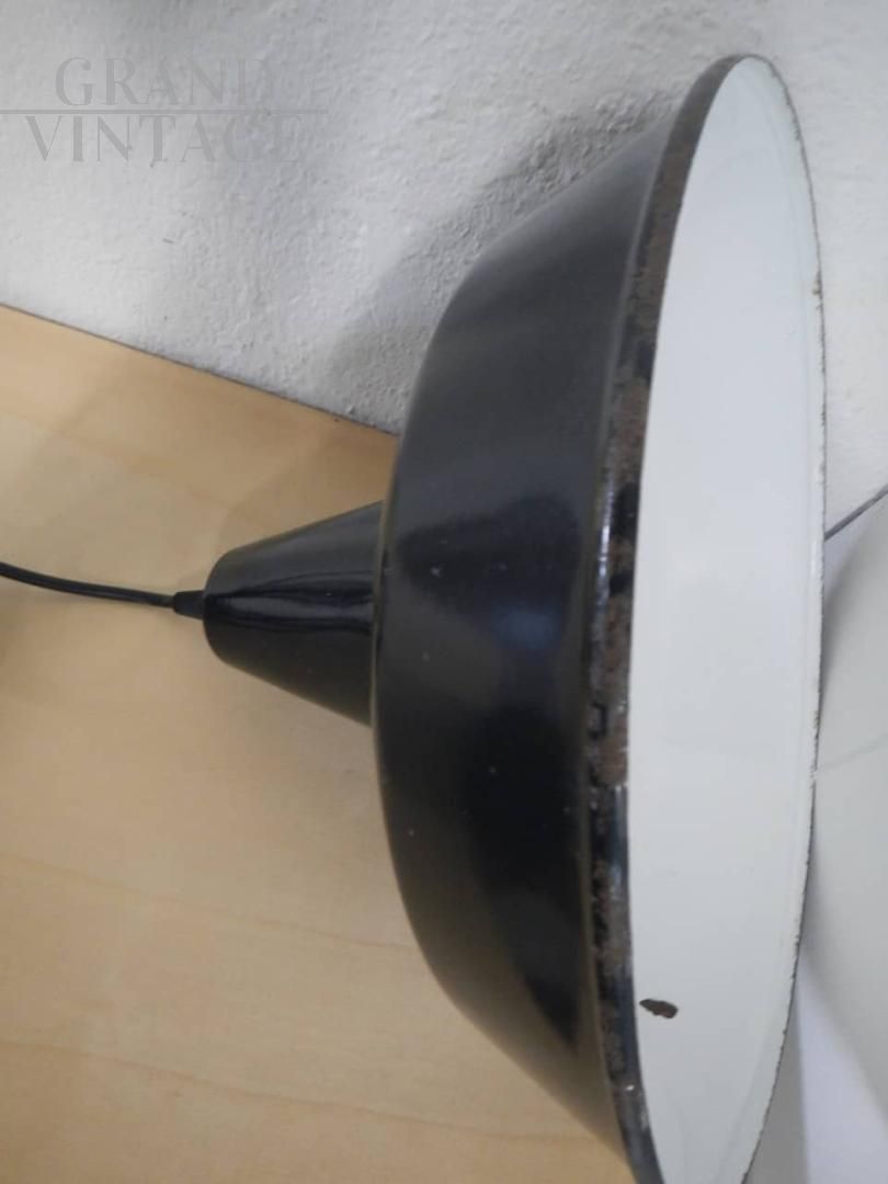 Lampada industriale a sospensione a imbuto in metallo nero con interno bianco, anni '40, diametro 45 cm, impianto elettrico ricablato e funzionante, attacco per lampadina E27. In buone condizioni.