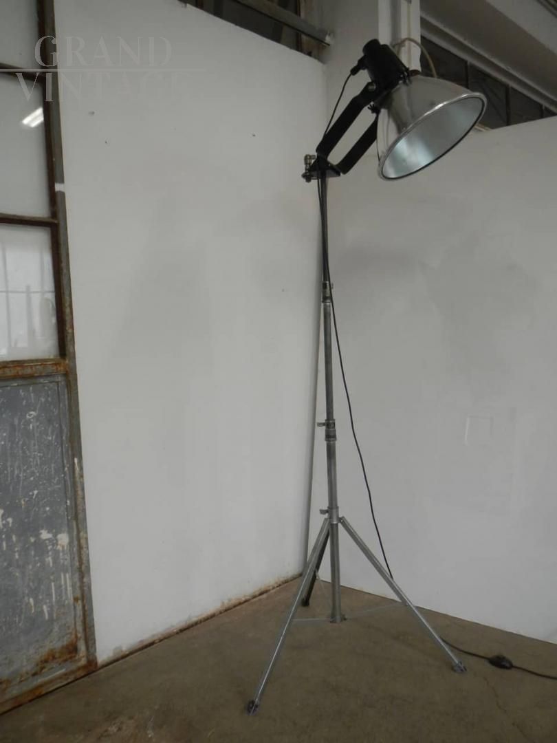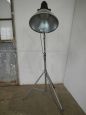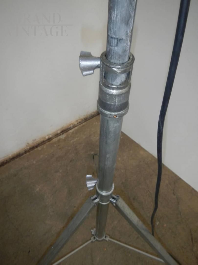 Lampada industriale vintage restaurata e funzionante anni '70 con cavalletto in metallo, misura regolabile in altezza da cm 158 a cm 205.