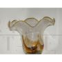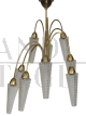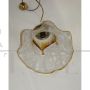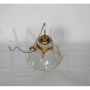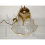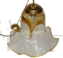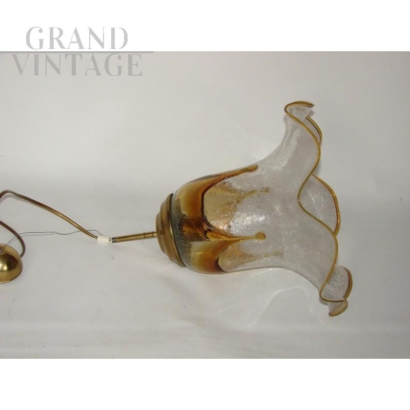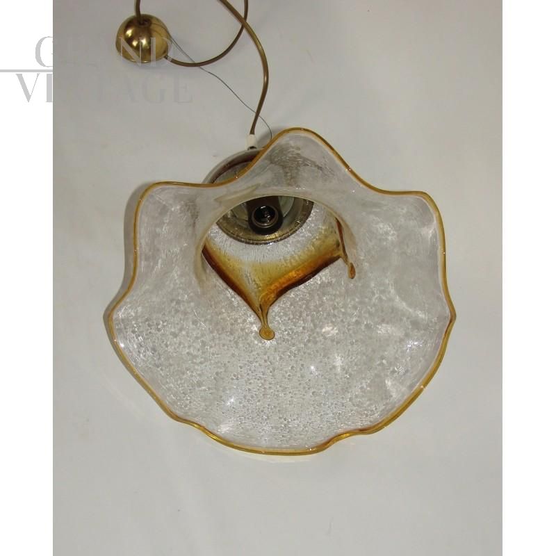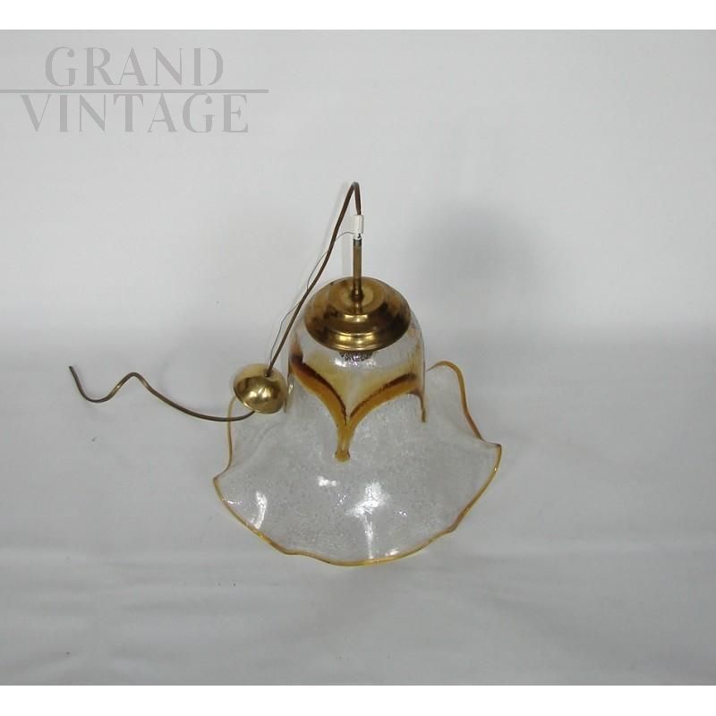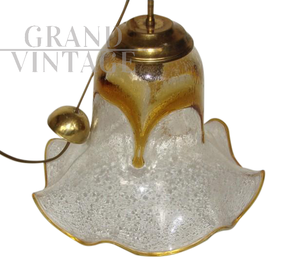 Lampada a sospensione in vetro di Murano, anni '70. Realizzata in ottone, paralume in vetro spesso con bolle. Richiede lampadina E27.