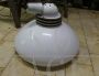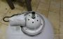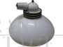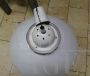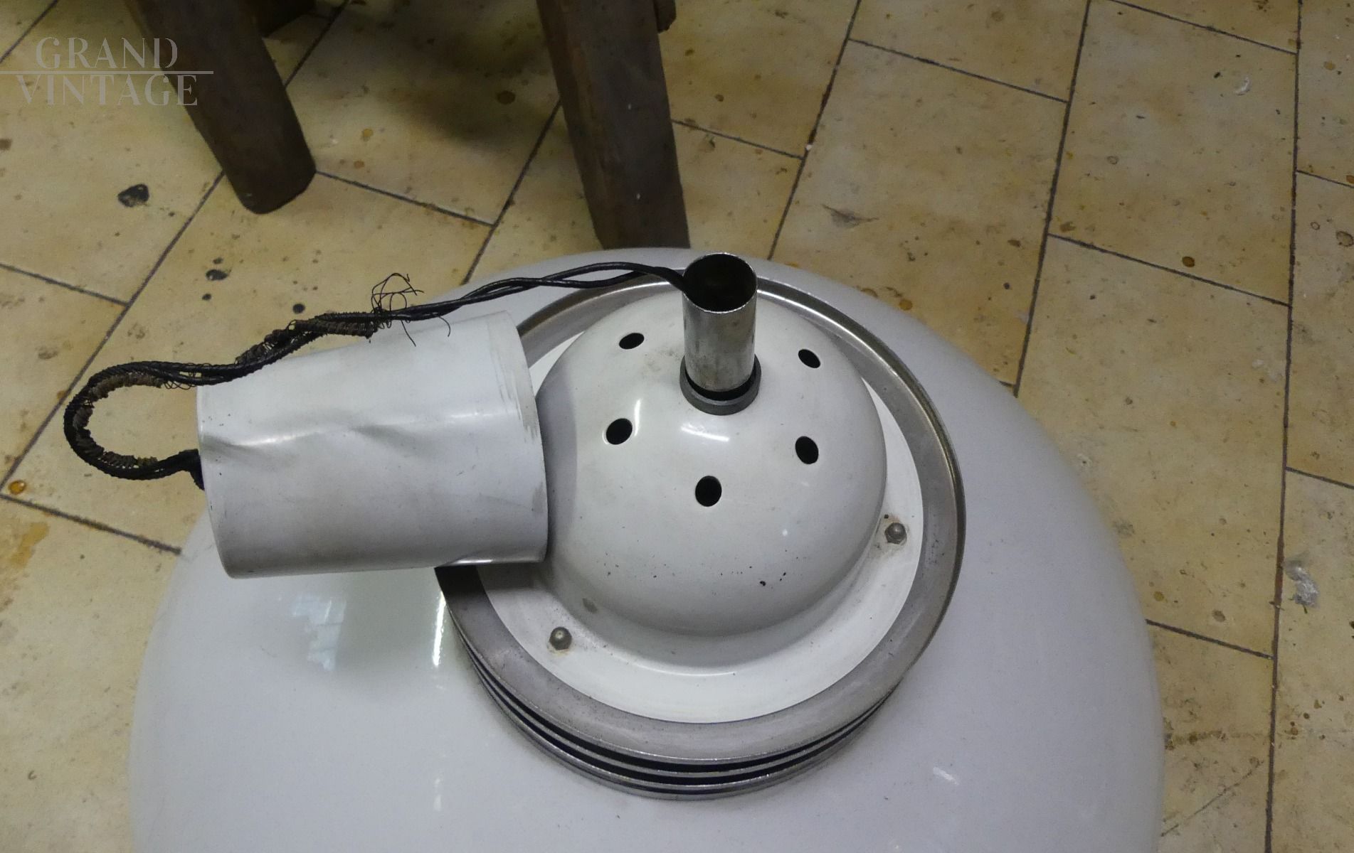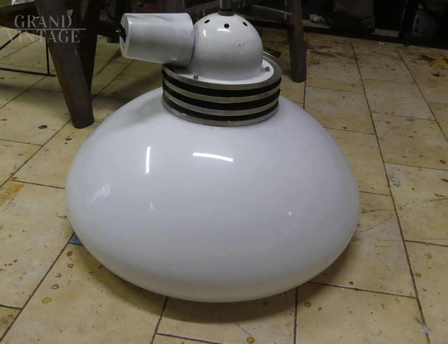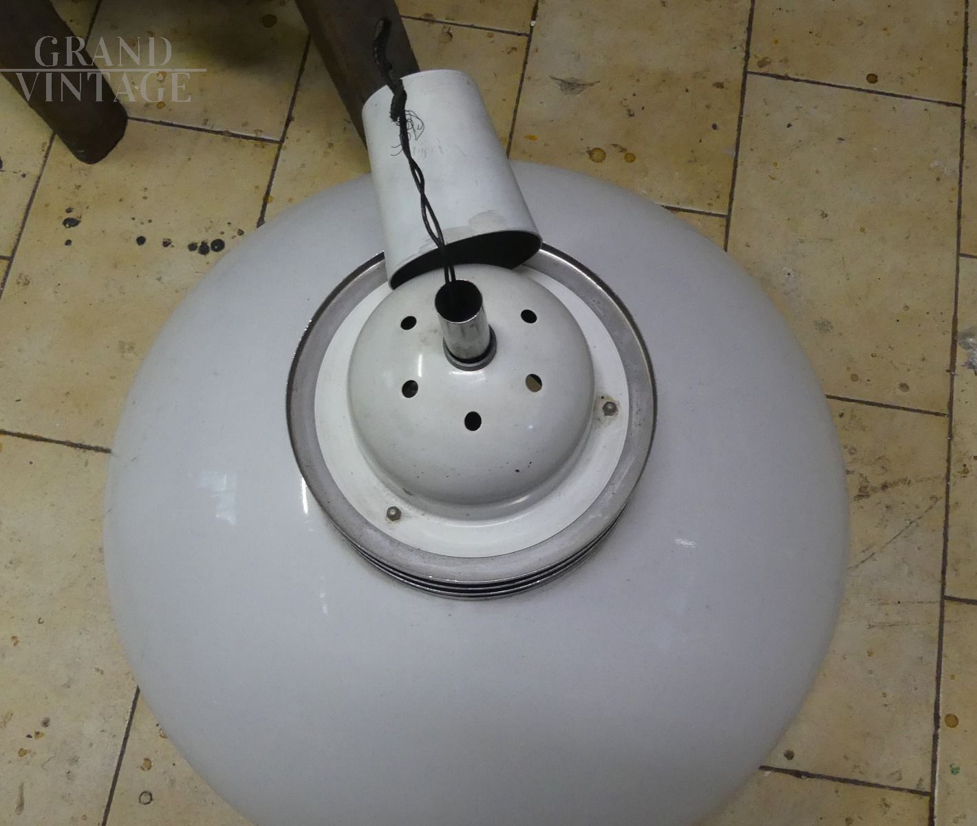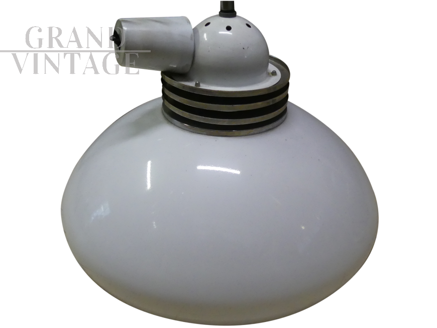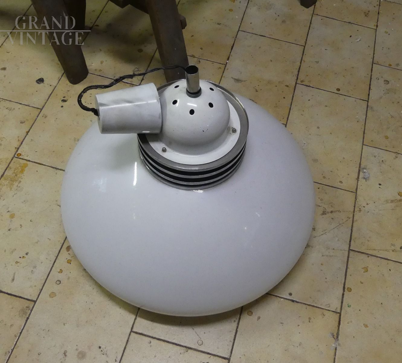 Lampada a sospensione a campana stondata, vintage anni '70, in plastica e con ghiera superiore in acciaio. Leggera sia come peso che come linee, adattabile a tutti i contesti.