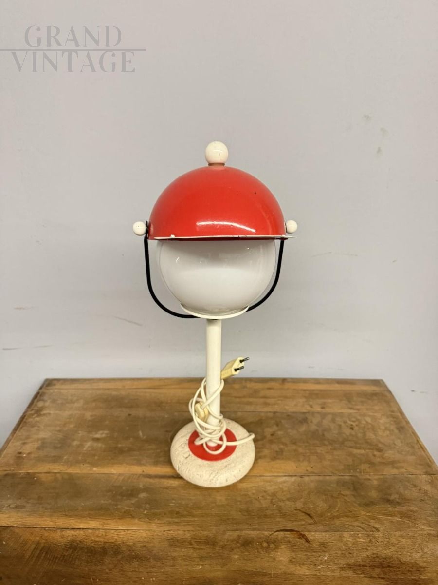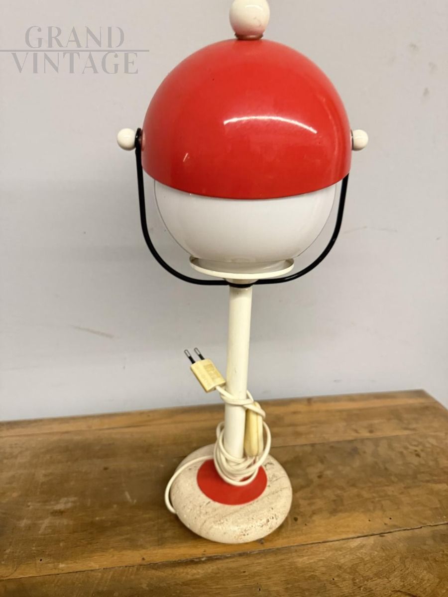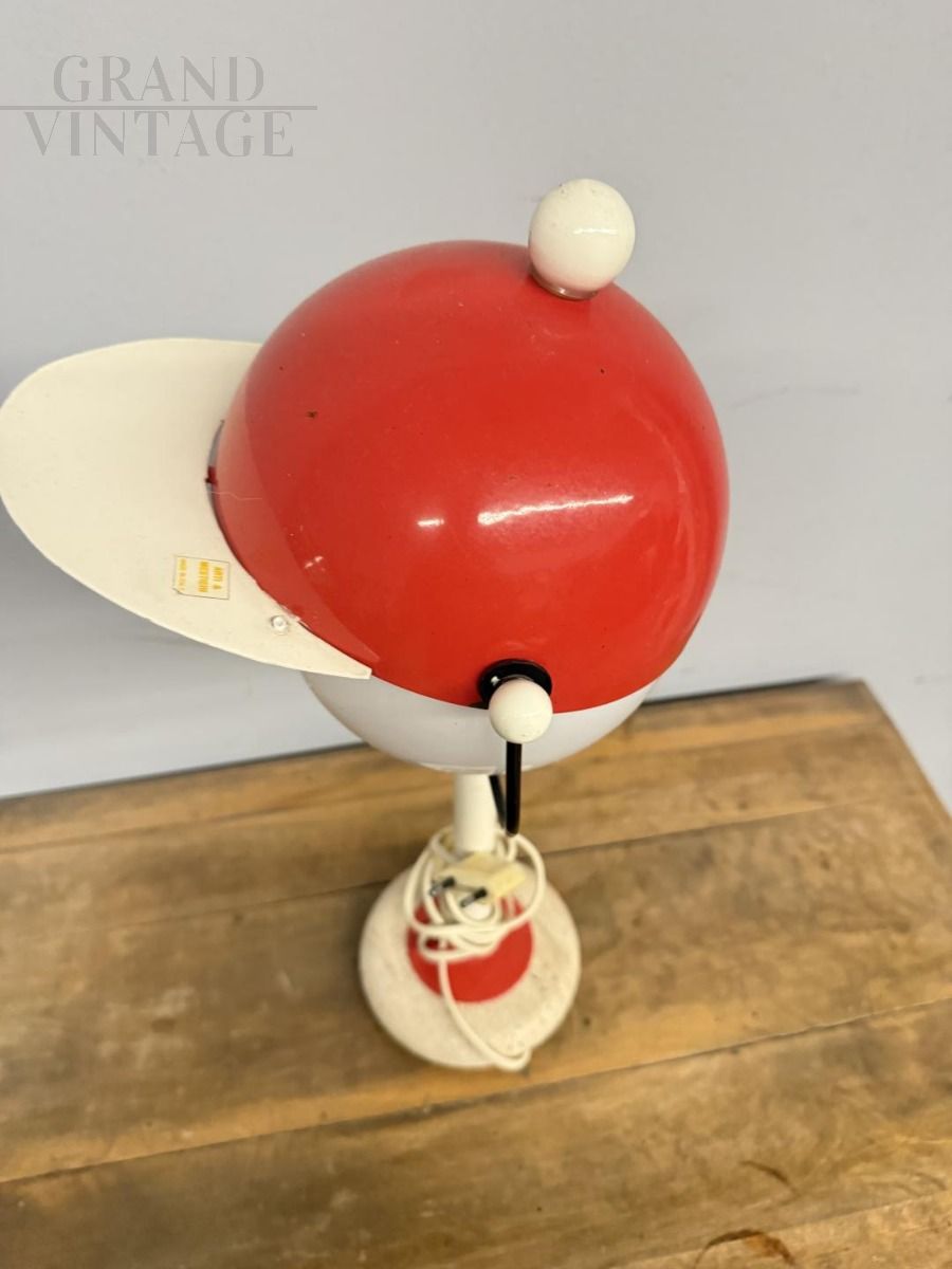Particolare lampada di modernariato con base rotonda in marmo travertino, struttura in metallo e paralume a sfera con un cappellino da baseball in plastica rossa, anni '70. Funzionante.