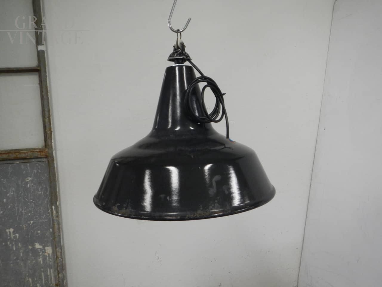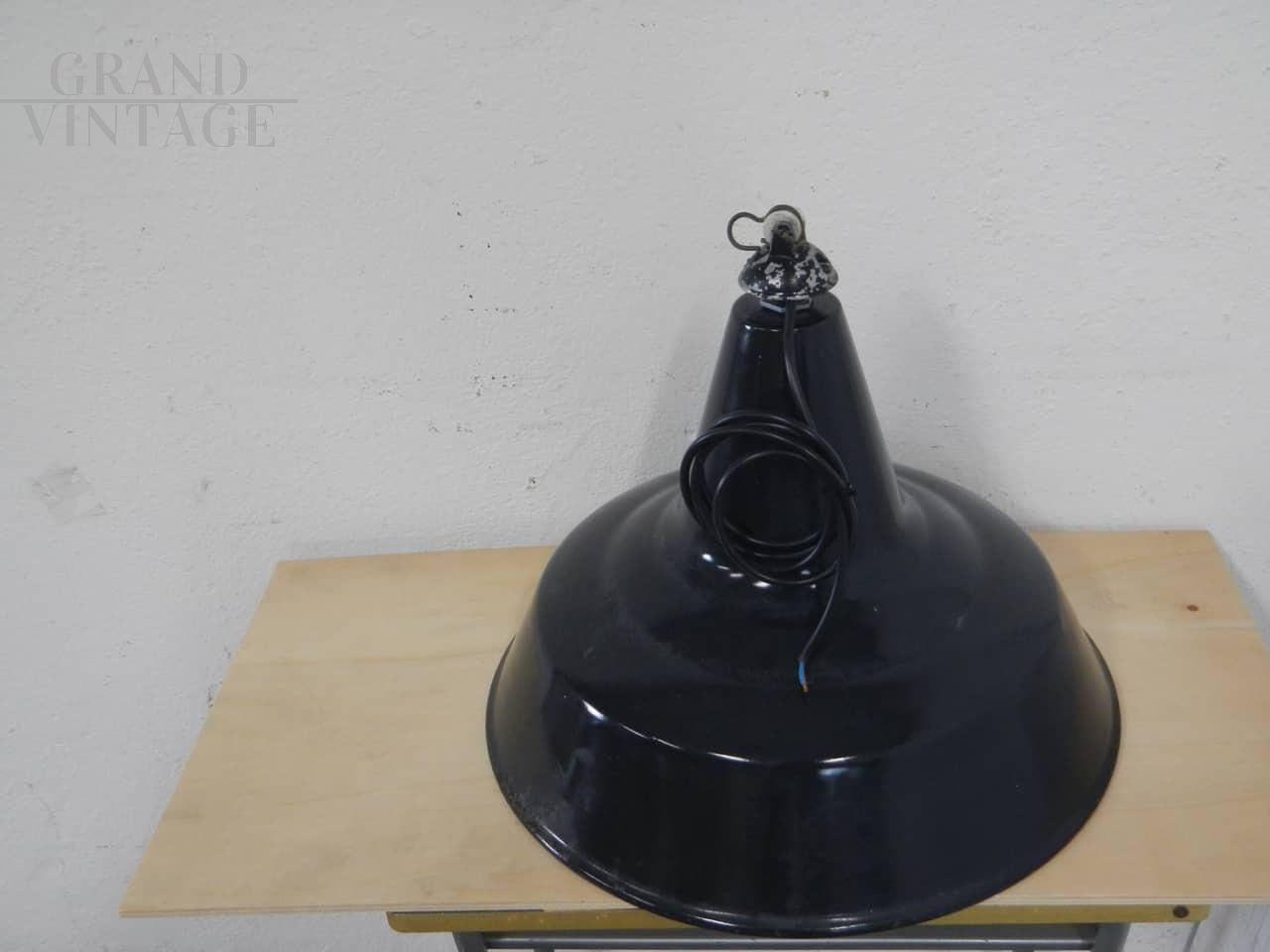 Lampada industriale a sospensione a imbuto in metallo nero con interno bianco e gancio in ceramica, anni '40, diametro 45 cm, impianto elettrico ricablato e funzionante, attacco per lampadina E27. In buone condizioni.