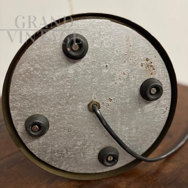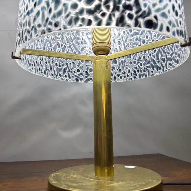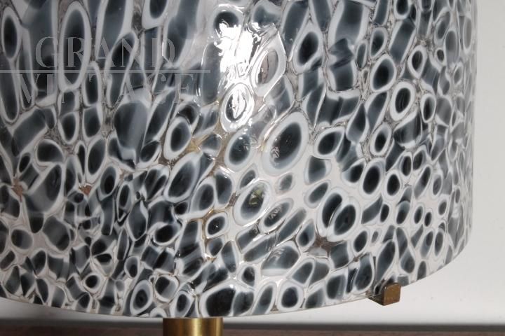 Bellissima lampada da tavolo della bottega Vistosi in ottone con cupola paralume in vetro di Murano con murrine bianche e nere, anni '70. Impianto elettrico revisionato.