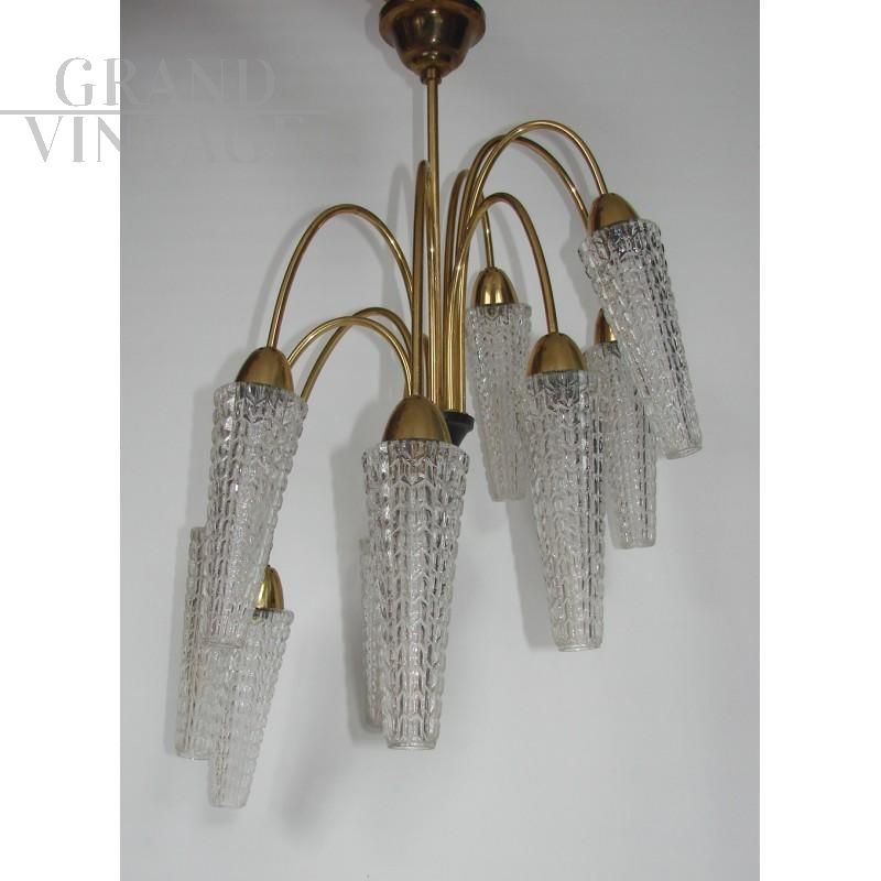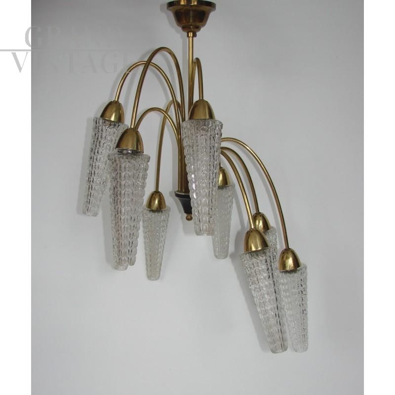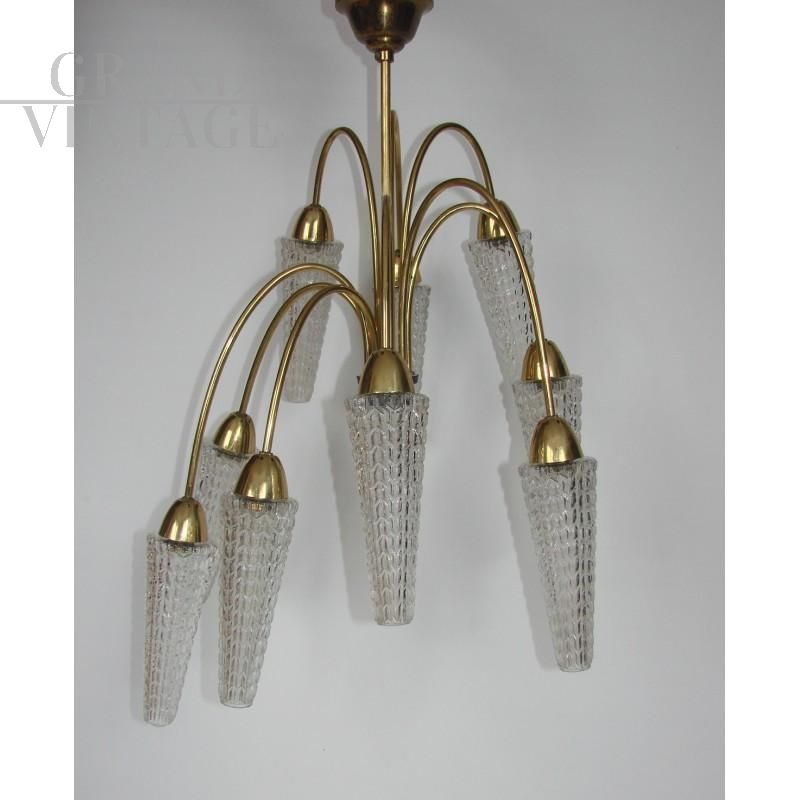 Lampadario vintage midcentury anni '60. Realizzato in ottone, paralumi in vetro. Conservato in buone condizioni, funzionante. Richiede 9 lampadine E14.