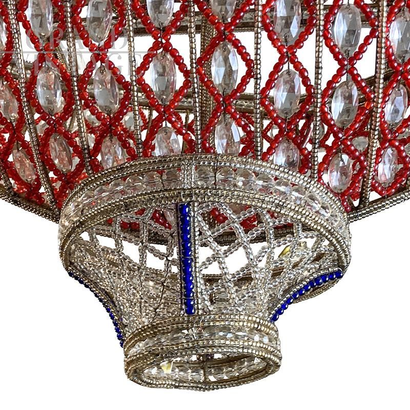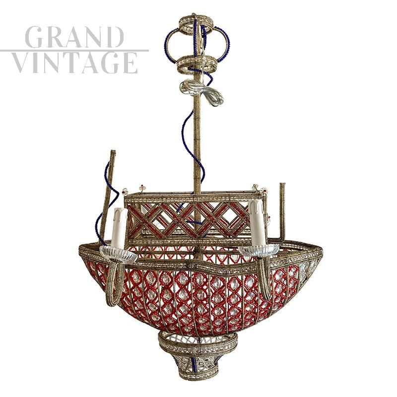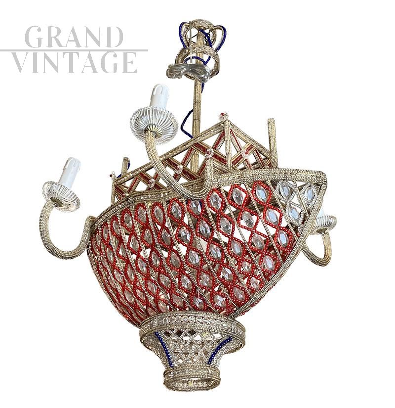Lampadario a forma di barca con struttura in metallo interamente ricoperta di perline in vetro di Murano rosso, blu, trasparente ed elementi in vetro molato trasparente. I quattro bracci esterni portano quattro luci con attacco per lampadine di tipo E14.
