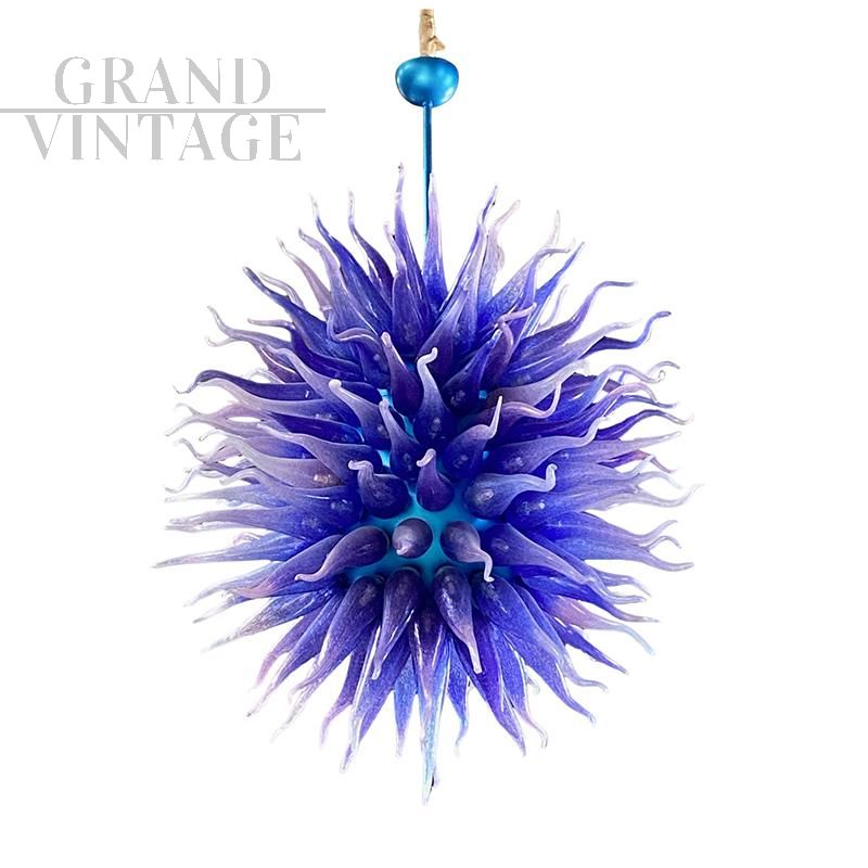 Lampadario lampada a sospensione Blue Sun in vetro di Murano sulle tonalità del blu con fiamme, composto da 101 punti luce, un capolavoro dell'artigianato di Murano che si ispira allo stile Sputnik.