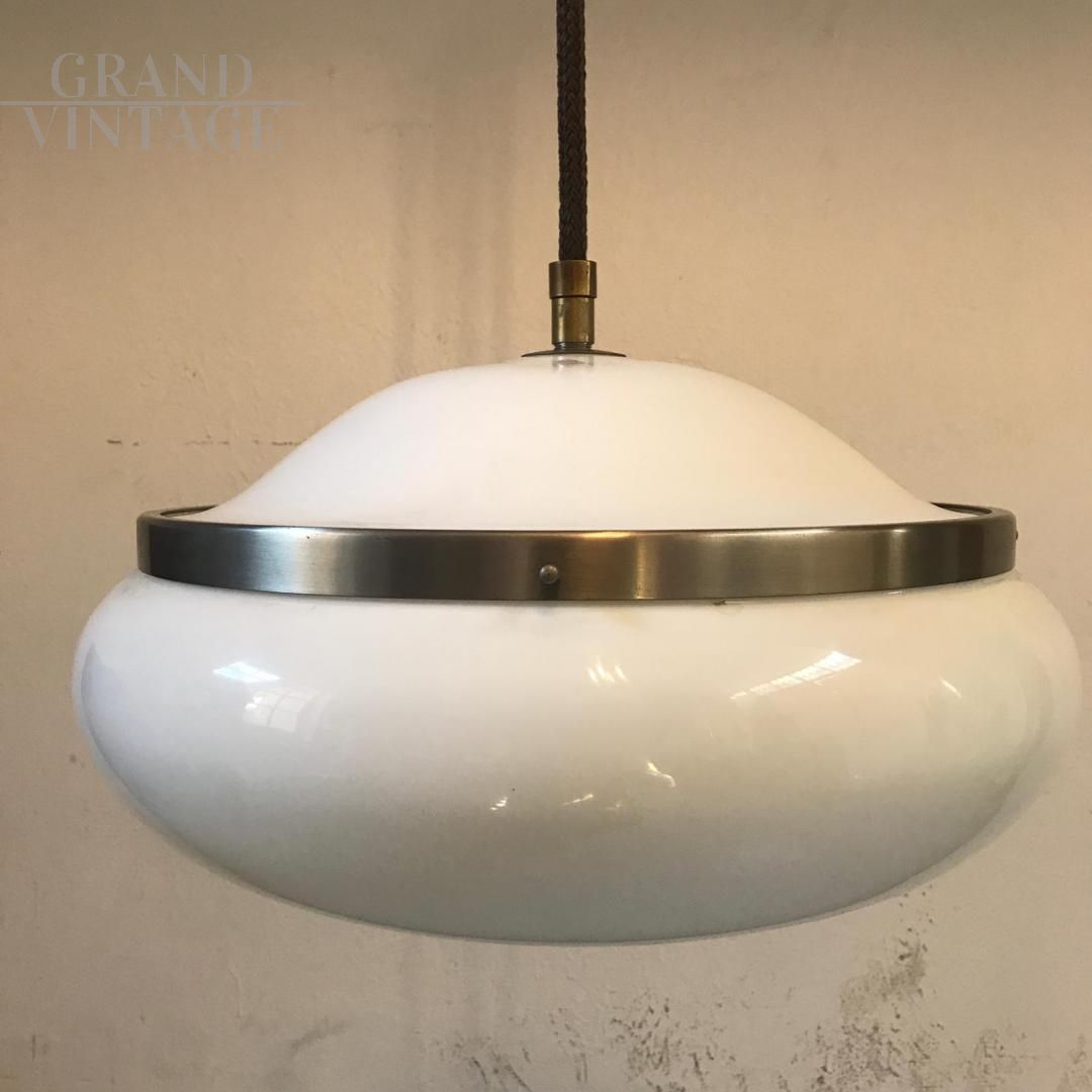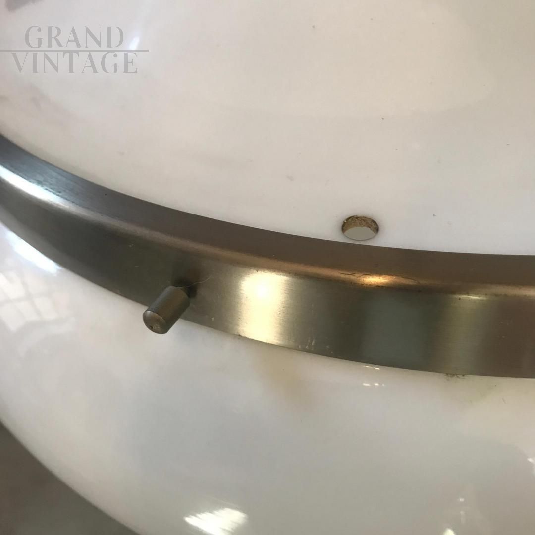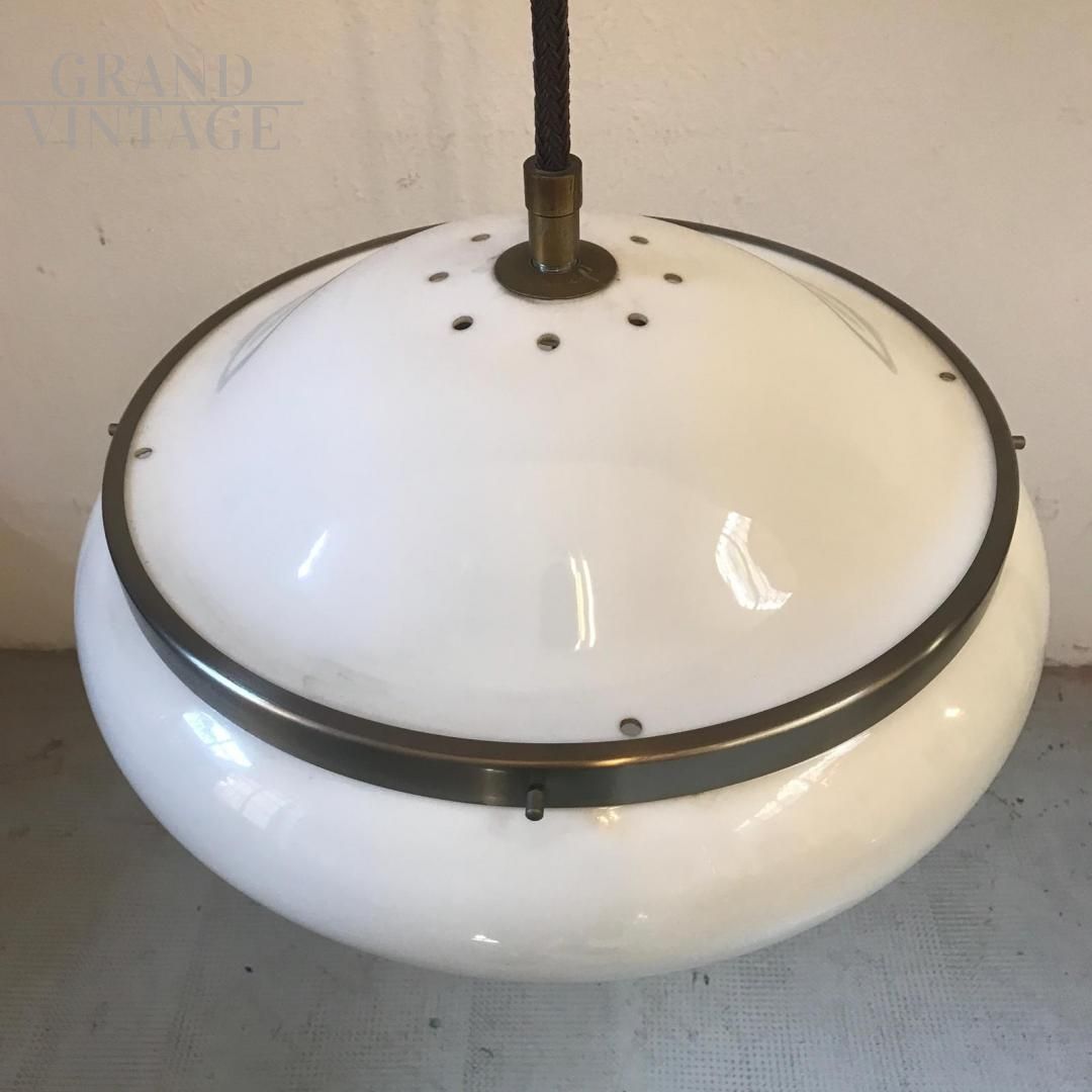 Lampada a sospensione a boccia disegnata da Gianemilio, Piero e Anna Monti per Kartell, modernariato italiano anni '60, in plastica e ottone nichelato, perfetto per arredare cucine o salotti.