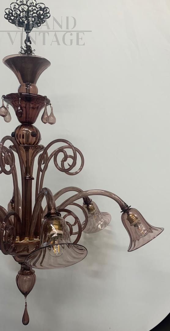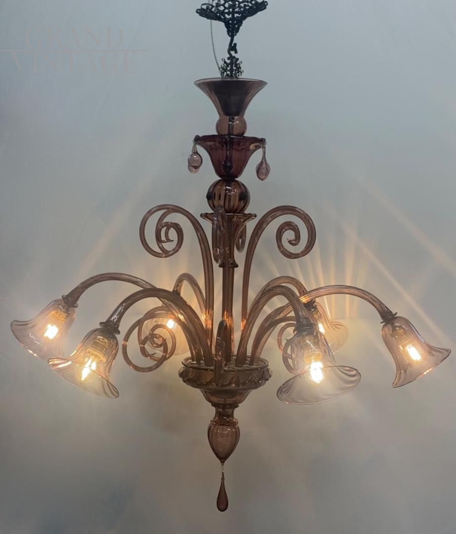 Grande lampadario attribuito alla ditta A.V.E.M. in vetro di Murano lavorato a mano con un bellissimo colore viola ametista, realizzato negli anni '20 - '30, molto scenografico e raro da trovare in queste condizioni, con vetri non crepati e con lievi naturali segni del tempo. Il lampadario è composto da 6 punti luce con attacchi per lampadine di tipo E27, l'impianto elettrico è stato rifatto a nuovo ed è adatto alle lampadine al Led. Il lampadario verrà smontato per favorirne un trasporto in sicurezza. Ottimo pezzo per illuminare diverse stanze, non abbaglia se vengono montate lampadine bianco latte.