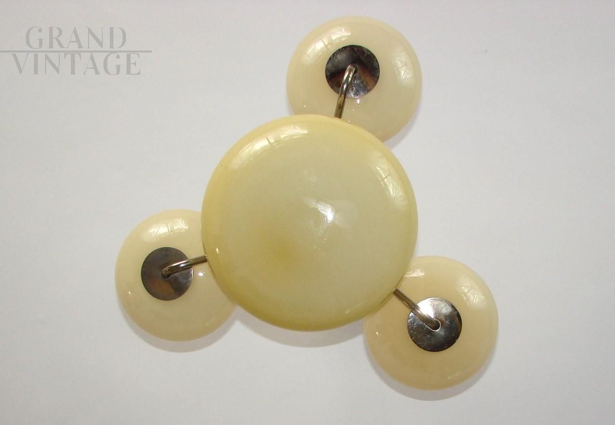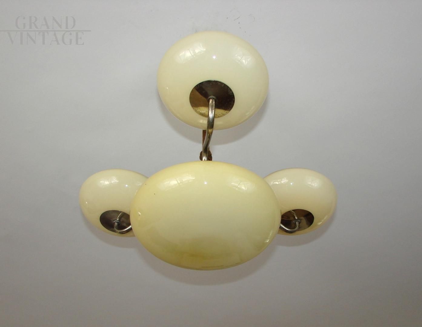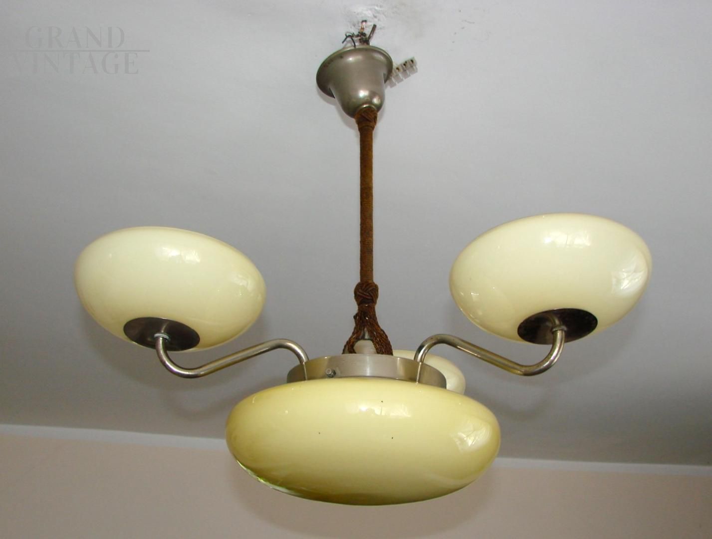 Lampadario art déco polacco anni '40 in ottone nichetalo con 4 luci con paralumi a ciotola in vetro stratificato, conservato nel suo stato originale, funzionante con 4 lampadine di tipo E27.