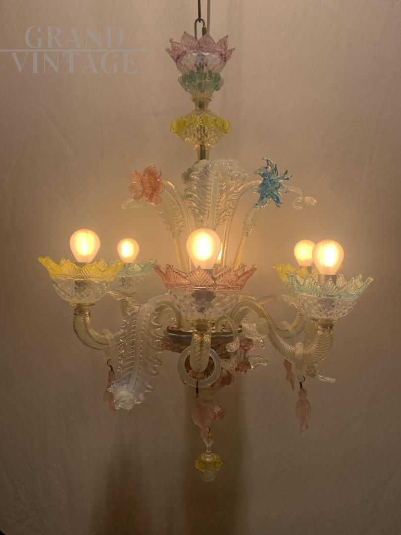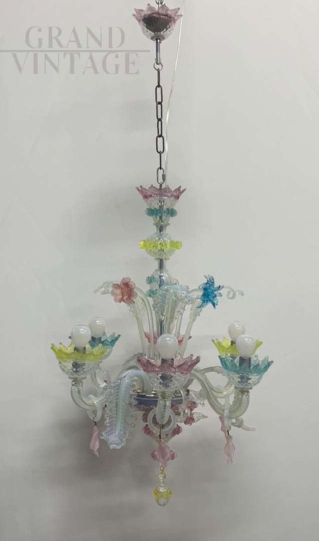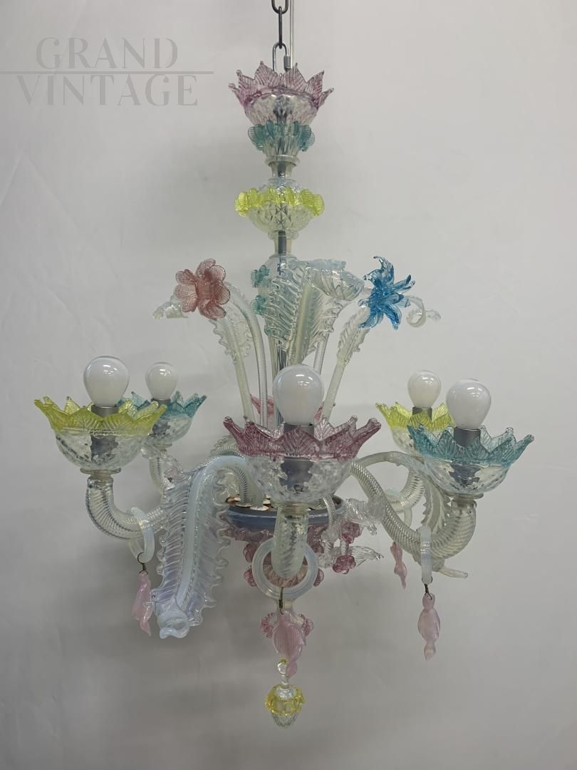 Bellissimo lampadario attribuito alla ditta Cesare Toso in vetro artistico di Murano lavorato a mano nei colori bianco opalino, azzurro, rosa e giallo. Il lampadario è molto scenografico, raro da trovare in queste condizioni, con vetri intatti e non crepati e con pochi e trascurabili segni del tempo sulla montatura. Impianto elettrico rifatto a nuovo con 6 attacchi per lampadine di tipo E14, adatti per le lampadine al Led. Il lampadario verrà in parte smontato per garantire un trasporto sicuro. Ottimo pezzo per illuminare diverse stanze: sala cucina o anche tavoli; non abbaglia se vengono montate lampadine bianco latte.