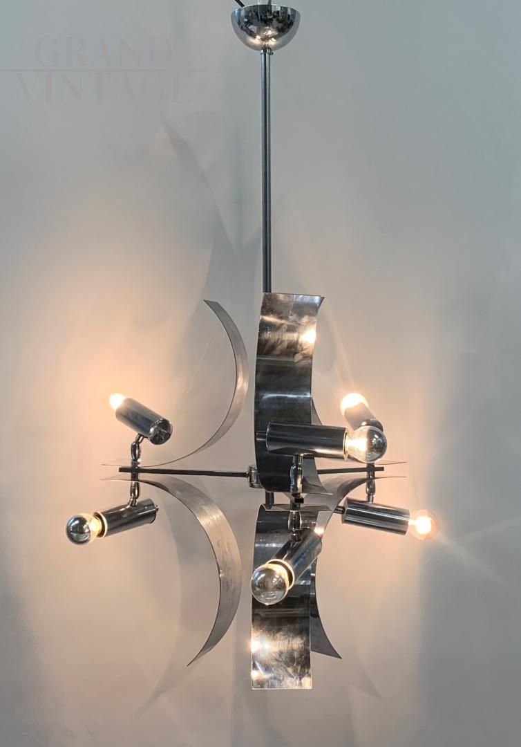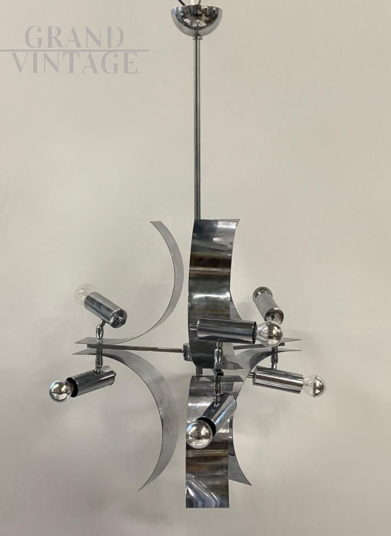 Fantastico e raro lampadario degli anni '70 attribuito alla ditta Reggiani, molto particolare con il suo stile space age, costituito da una struttura in ferro cromato e da diversi punti luce a faretto direzionabili. in buone condizioni, ha qualche naturale segno del tempo sulla cromatura. Il lampadario ha un impianto elettrico rifatto a nuovo, ed è funzionante con lampadine di tipo E14, si consiglia l'utilizzo di lampadine al Led con cromatura superficiale. Ottimo elemento che può illuminare ogni stanza: dalla cucina alla sala, dall'entrata alla camera o il bagno.