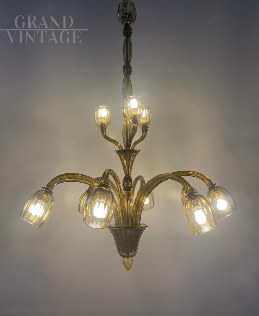 Lampadario attr. Venini anni '30 in vetro di Murano ambrato